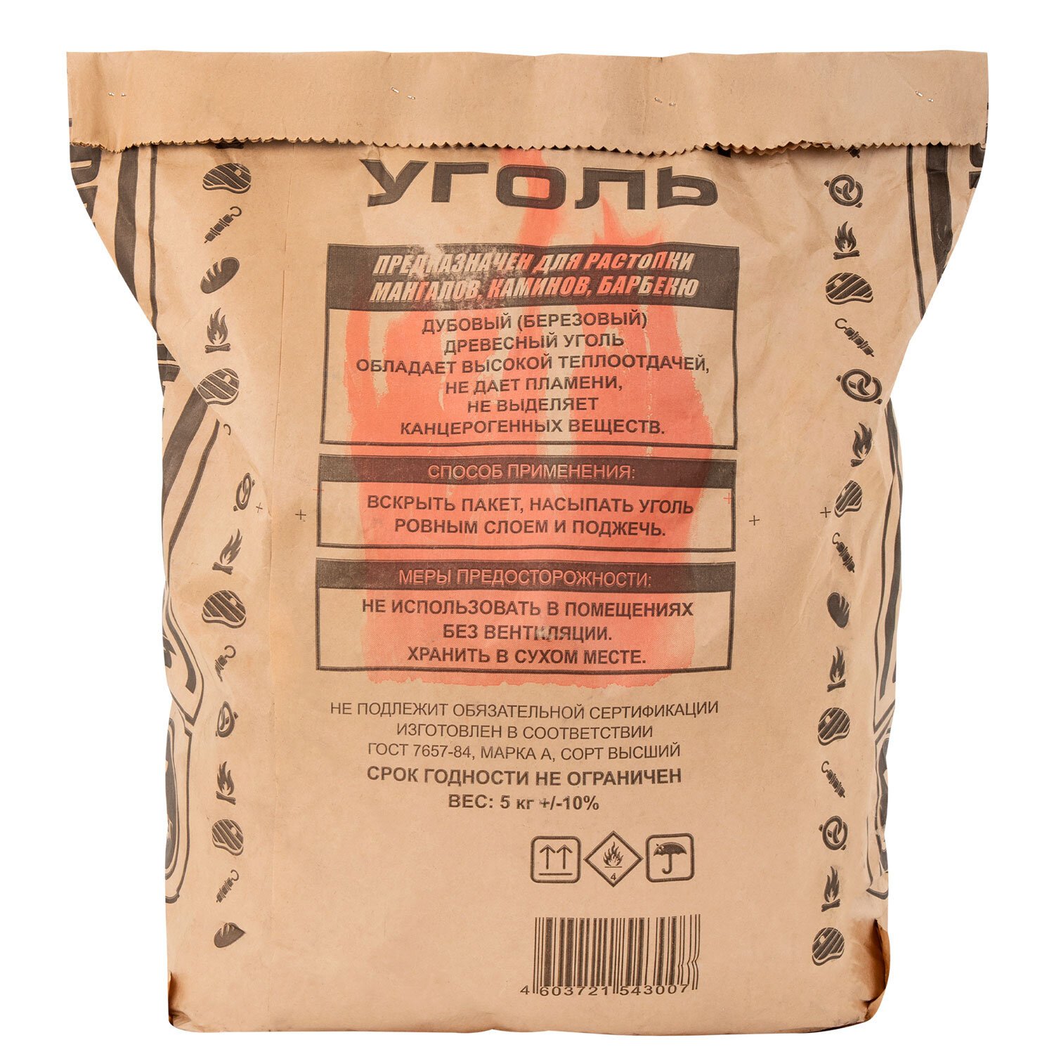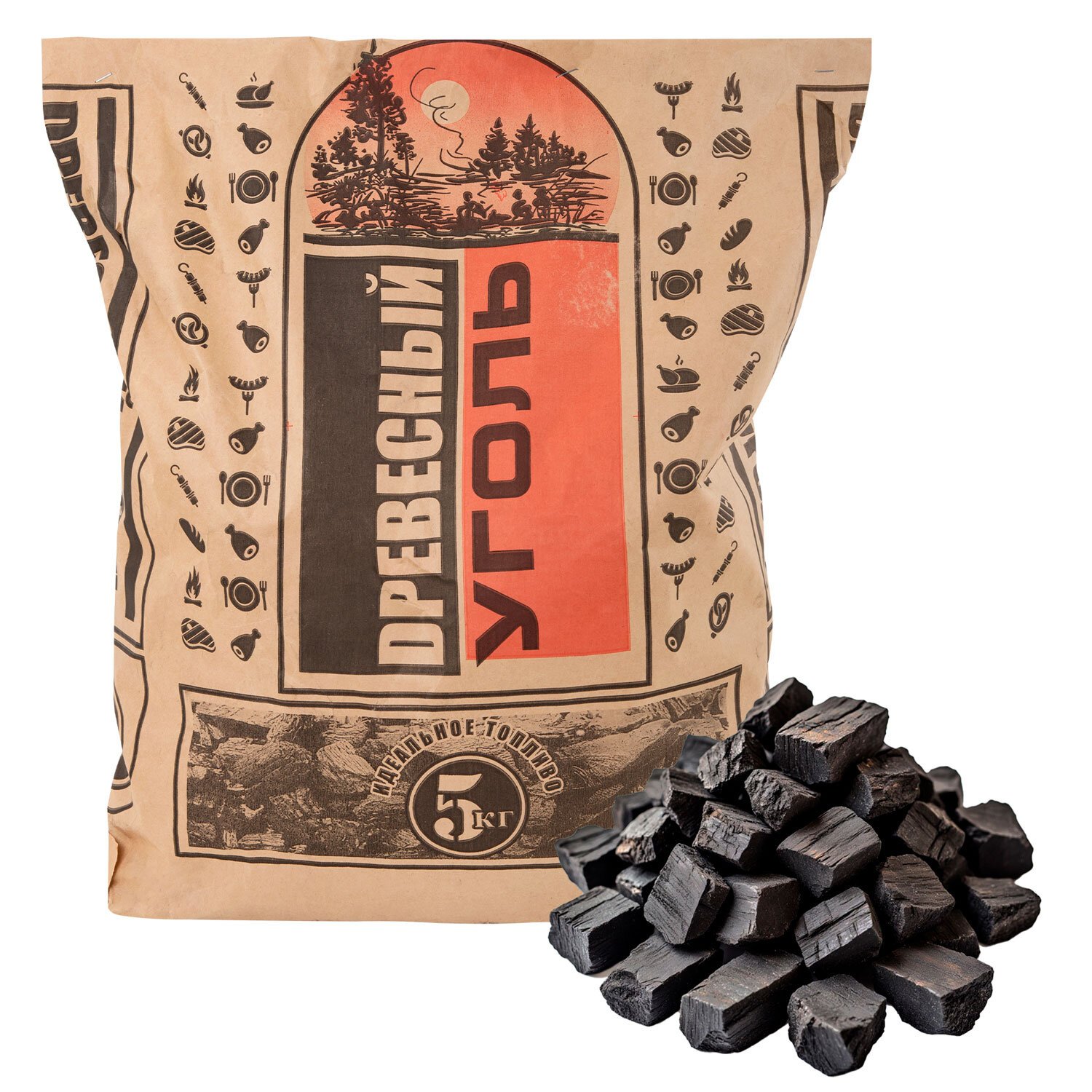 Уголь изготовлен из отборных сортов древесины. Вес — 5 кг. Подходит для всех типов грилей и мангалов, отличается долгим горением, отсутствием копоти и легким розжигом. Обладает высокой теплоотдачей, не дает открытого пламени, не выделяет вредных веществ — идеален для приготовления еды на открытом огне.