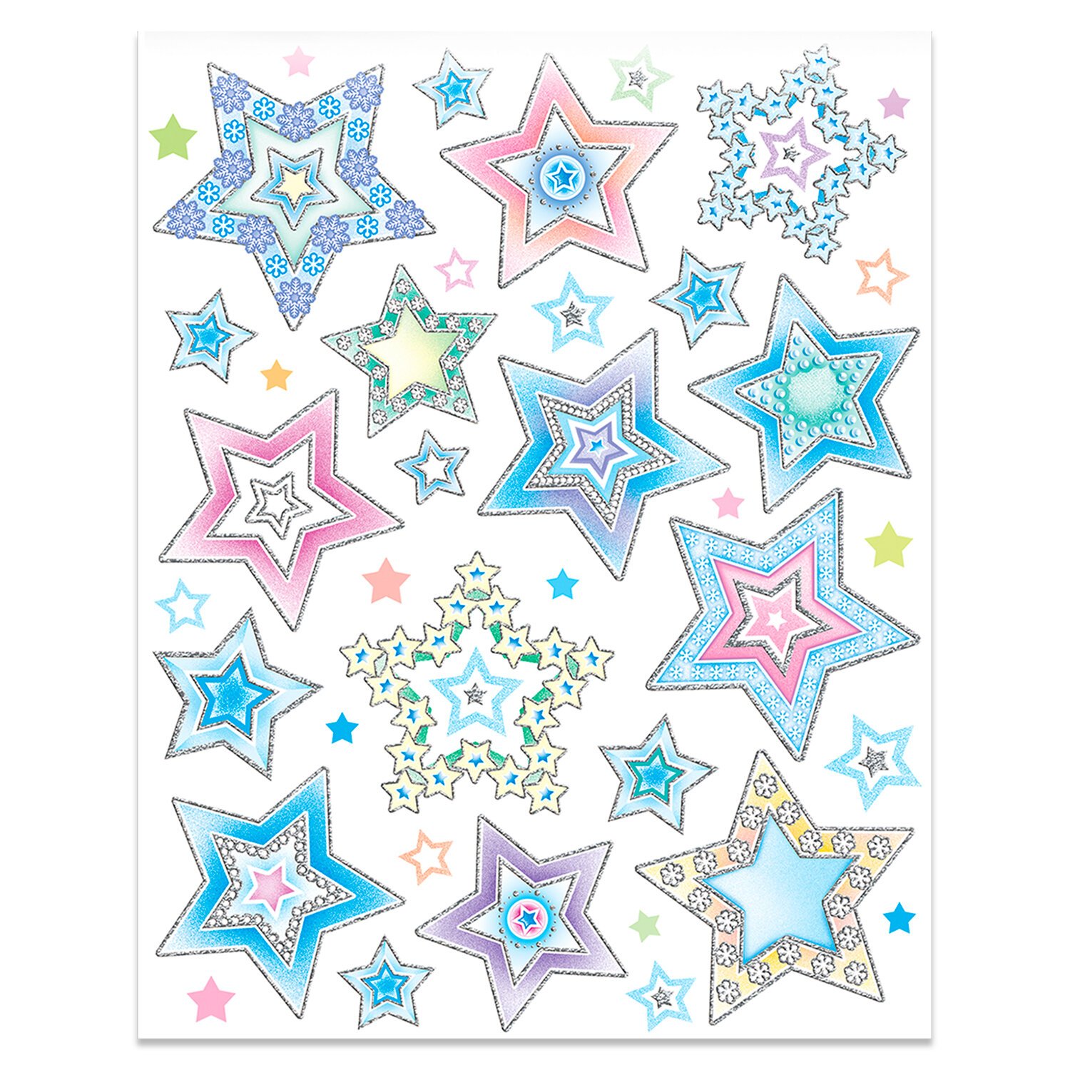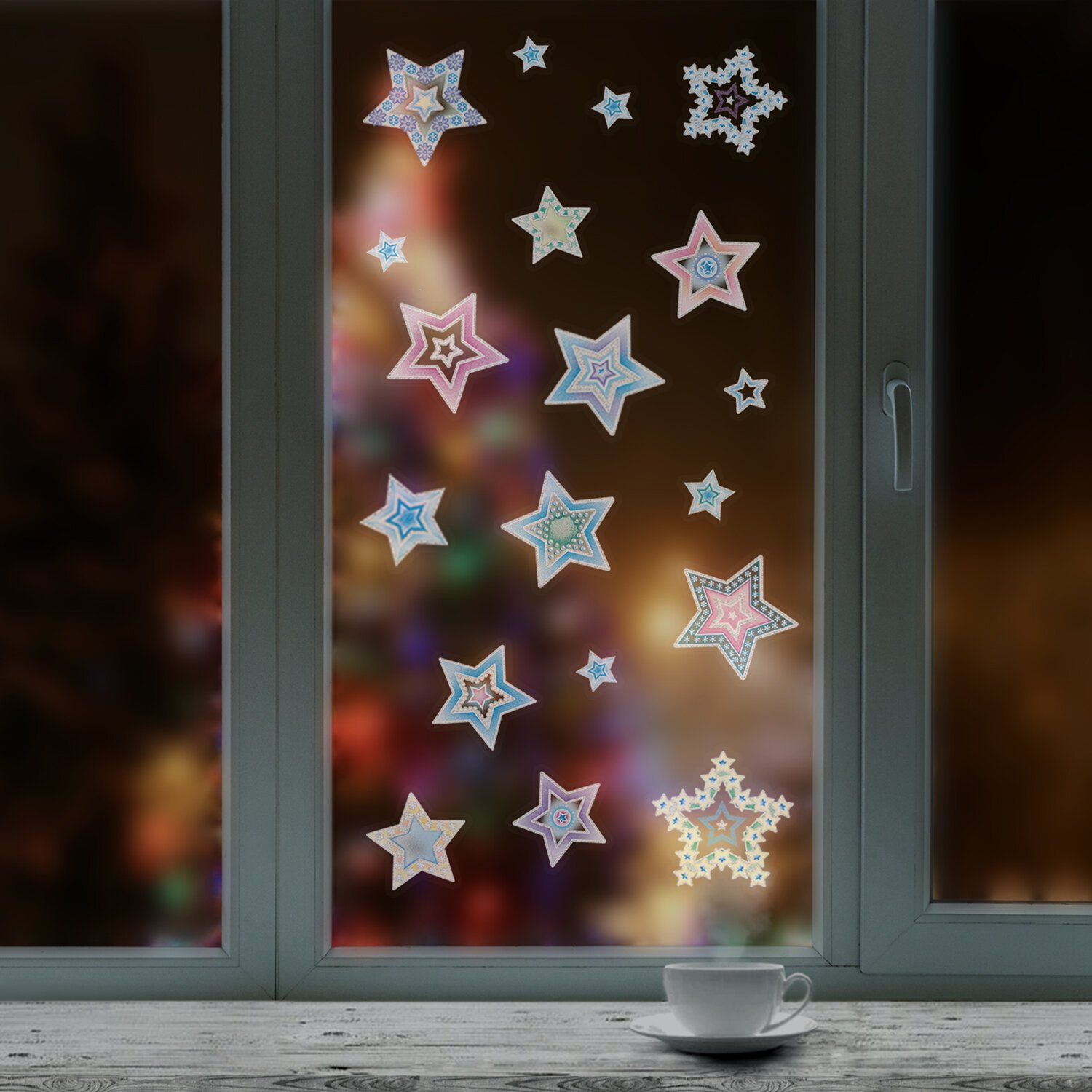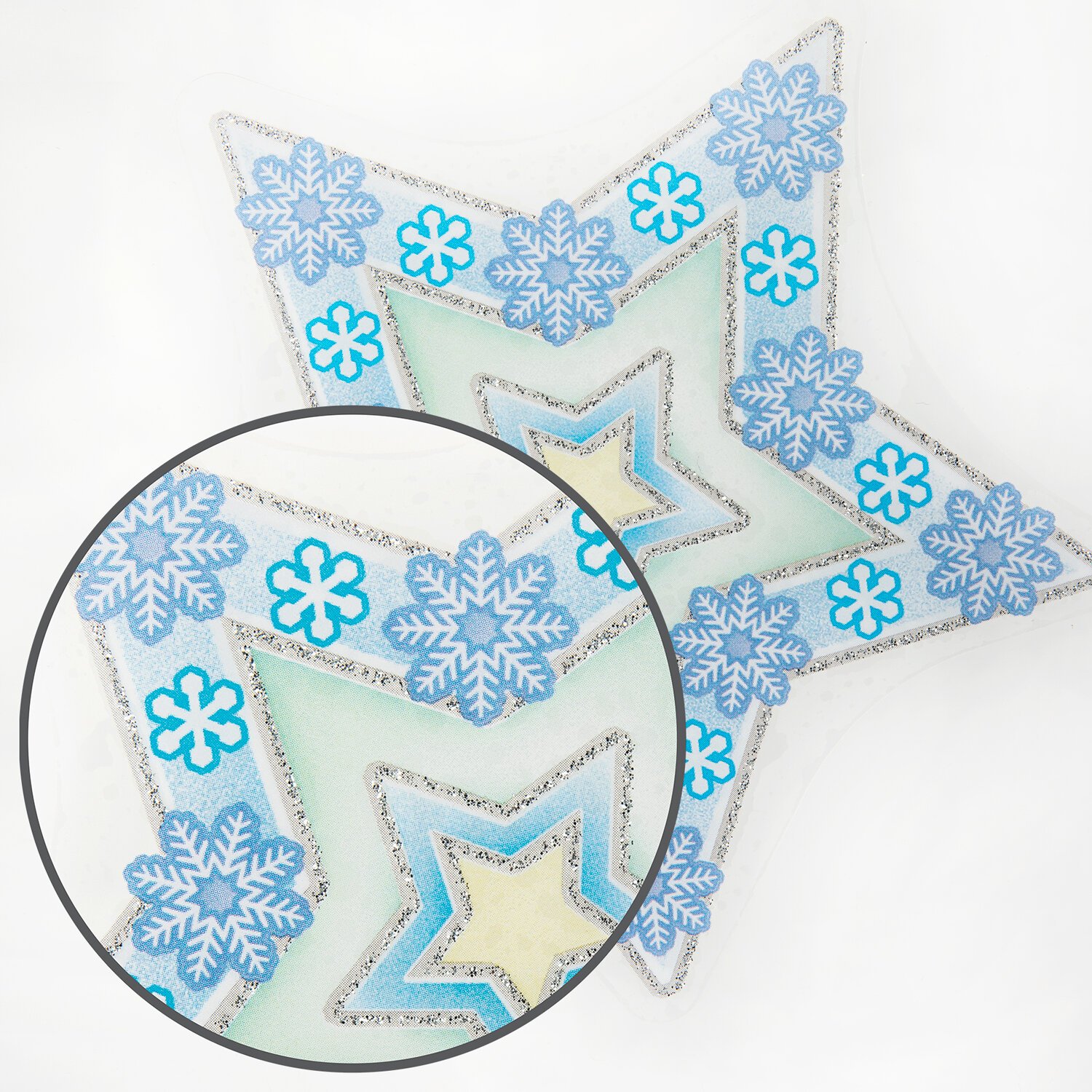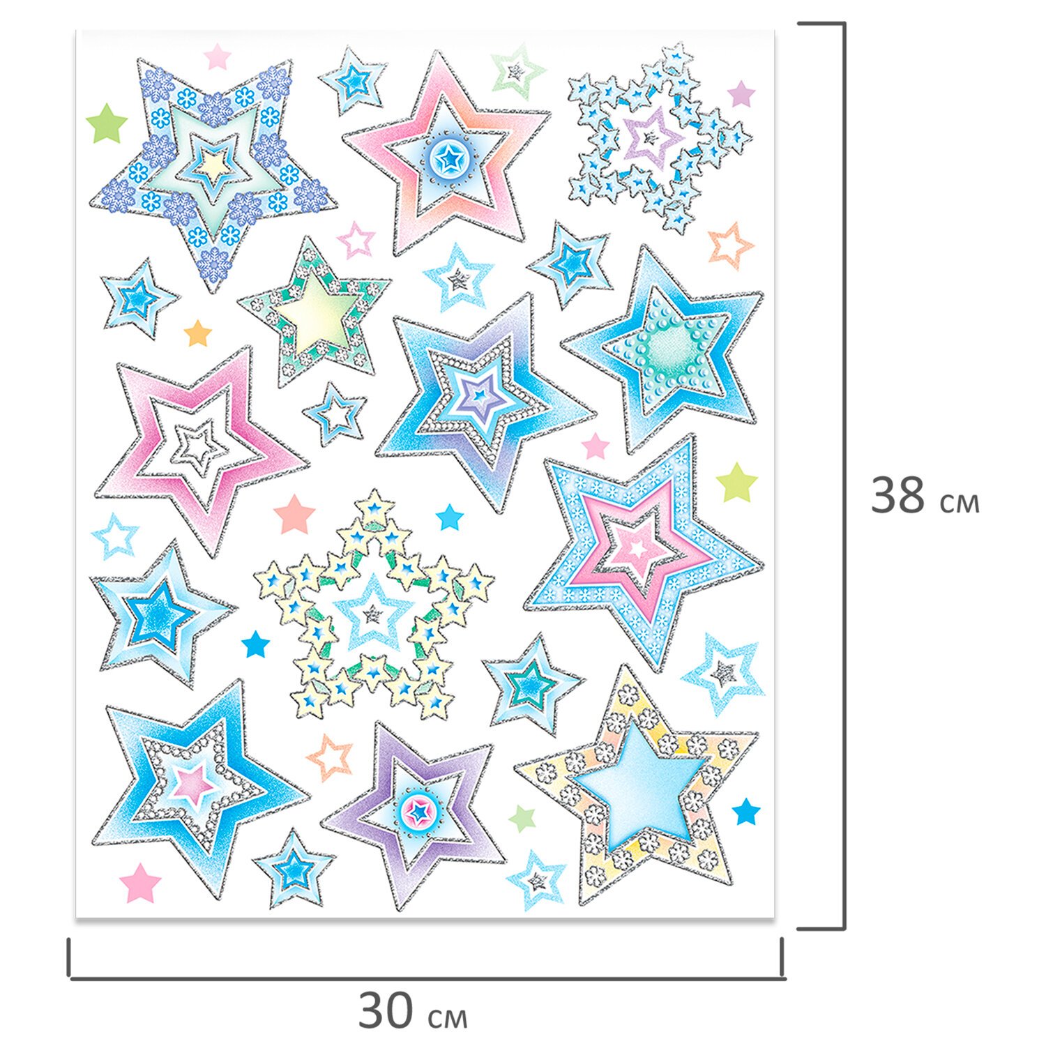 Изделие с изображением цветных звезд и снежинок представляет собой наклейку на окно/стекло, изготовленную из поливинилхлорида (ПВХ). Наклейка размером 30x38 см декорирована серебристым глиттером. Украшение предназначено для декорирования окон, зеркал, стекол и других ламинированных глянцевых поверхностей. Не оставляет клеевых следов и предназначено для многократного использования. Крепится к поверхности посредством статического эффекта. Украшение на белой картонной подложке упаковано в прозрачный полипропиленовый пакет на картонном подвесе.