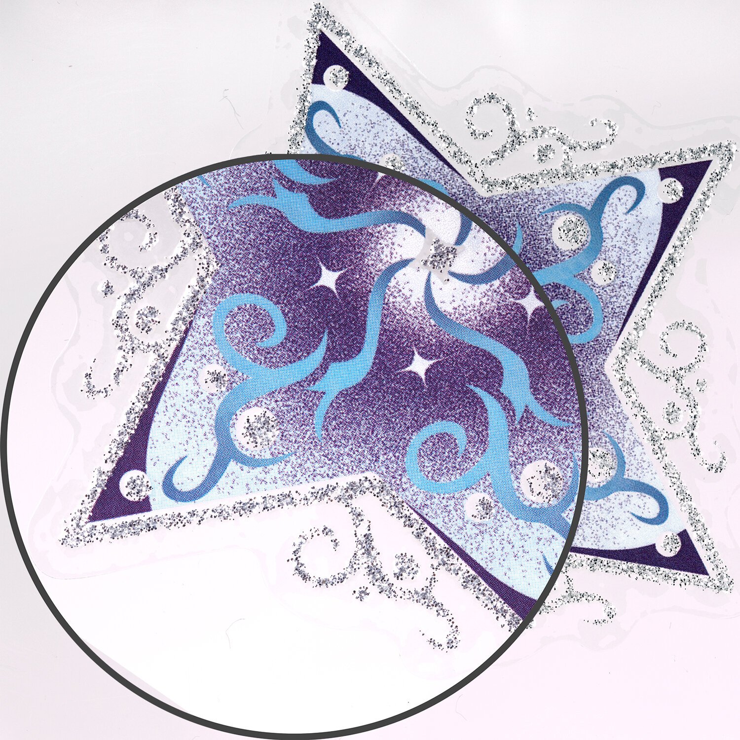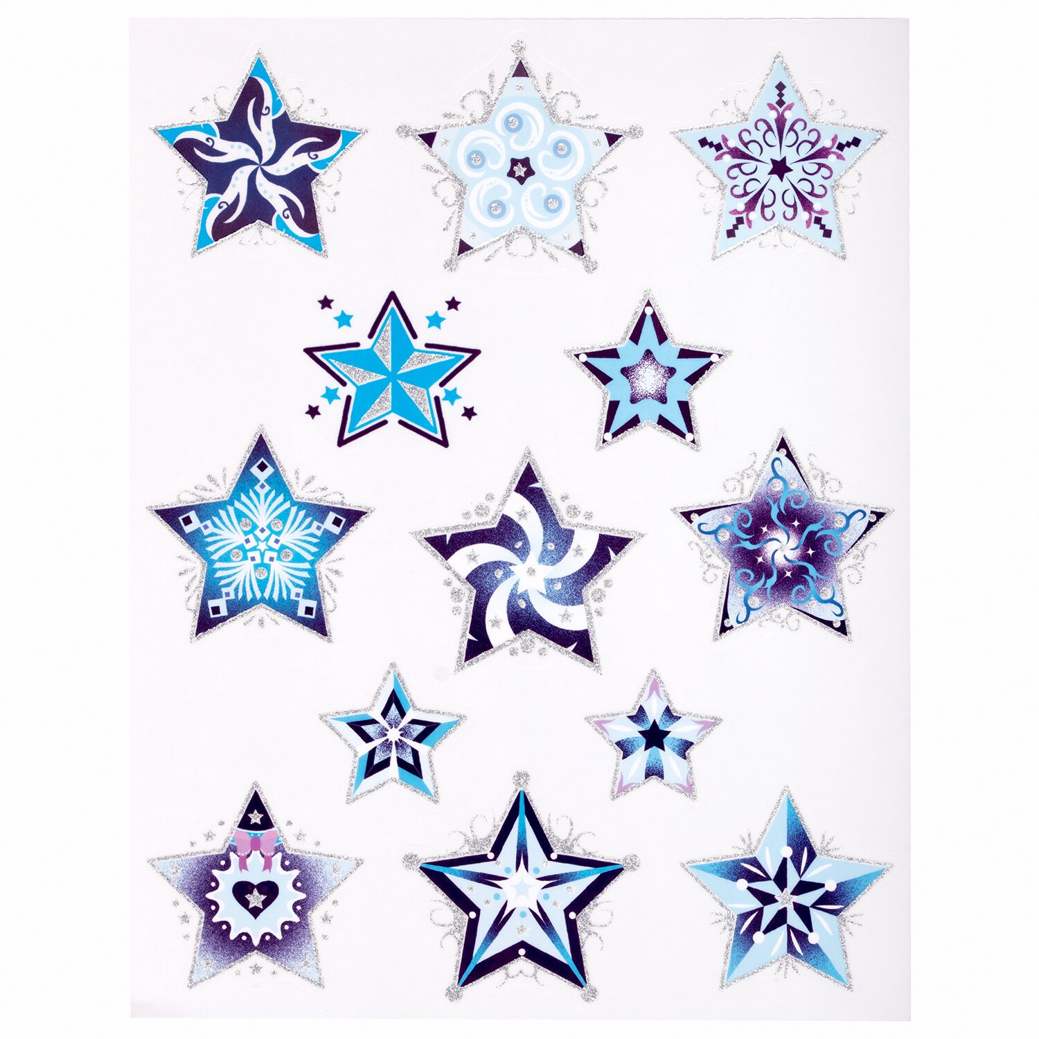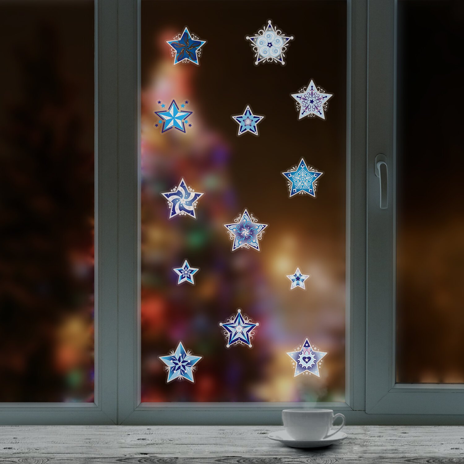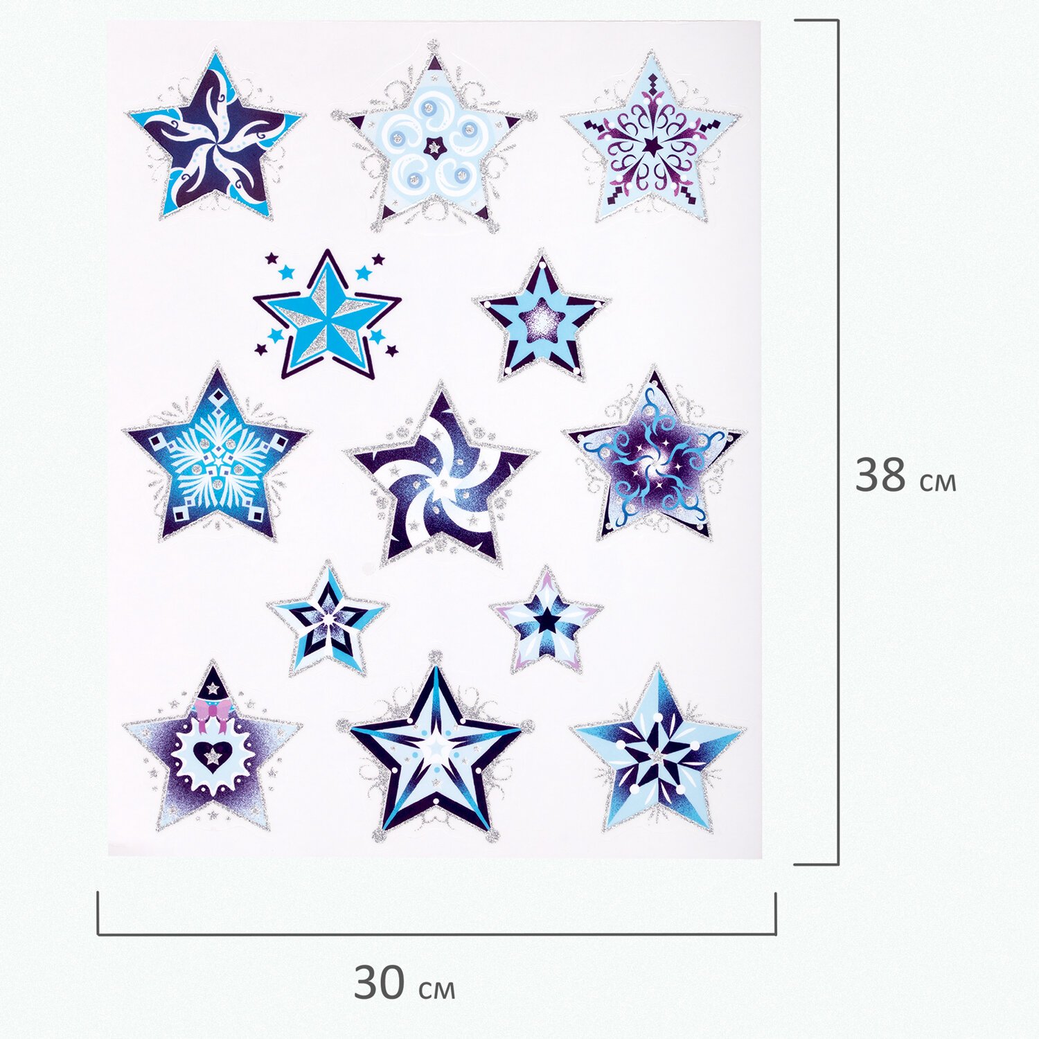 Изделие с изображением сине-голубых снежинок в виде звезд представляет собой наклейку, изготовленную из поливинилхлорида (ПВХ). Наклейка размером 30x38 см декорирована серебристым глиттером. Украшение предназначено для декорирования окон, зеркал, стекол и других ламинированных глянцевых поверхностей. Не оставляет клеевых следов и предназначено для многократного использования. Крепится к поверхности посредством статического эффекта. Украшение на белой картонной подложке упаковано в прозрачный полипропиленовый пакет на картонном подвесе.