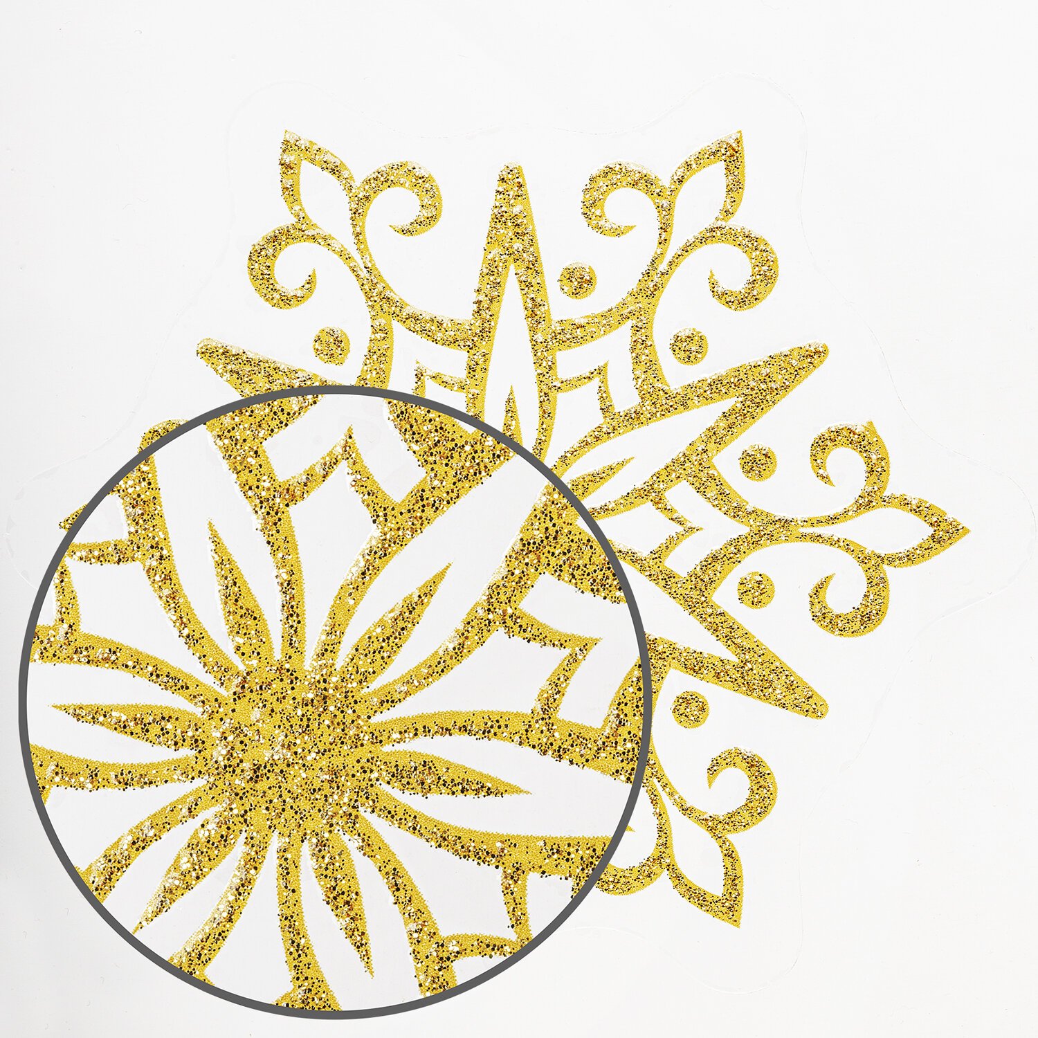 Изделие с изображением золотистых снежинок представляет собой наклейку, изготовленную из поливинилхлорида (ПВХ). Наклейка размером 30x38 см декорирована золотистым глиттером. Украшение предназначено для декорирования окон, зеркал, стекол и других ламинированных глянцевых поверхностей. Не оставляет клеевых следов и предназначено для многократного использования. Крепится к поверхности посредством статического эффекта. Украшение на белой картонной подложке упаковано в прозрачный полипропиленовый пакет на картонном подвесе.