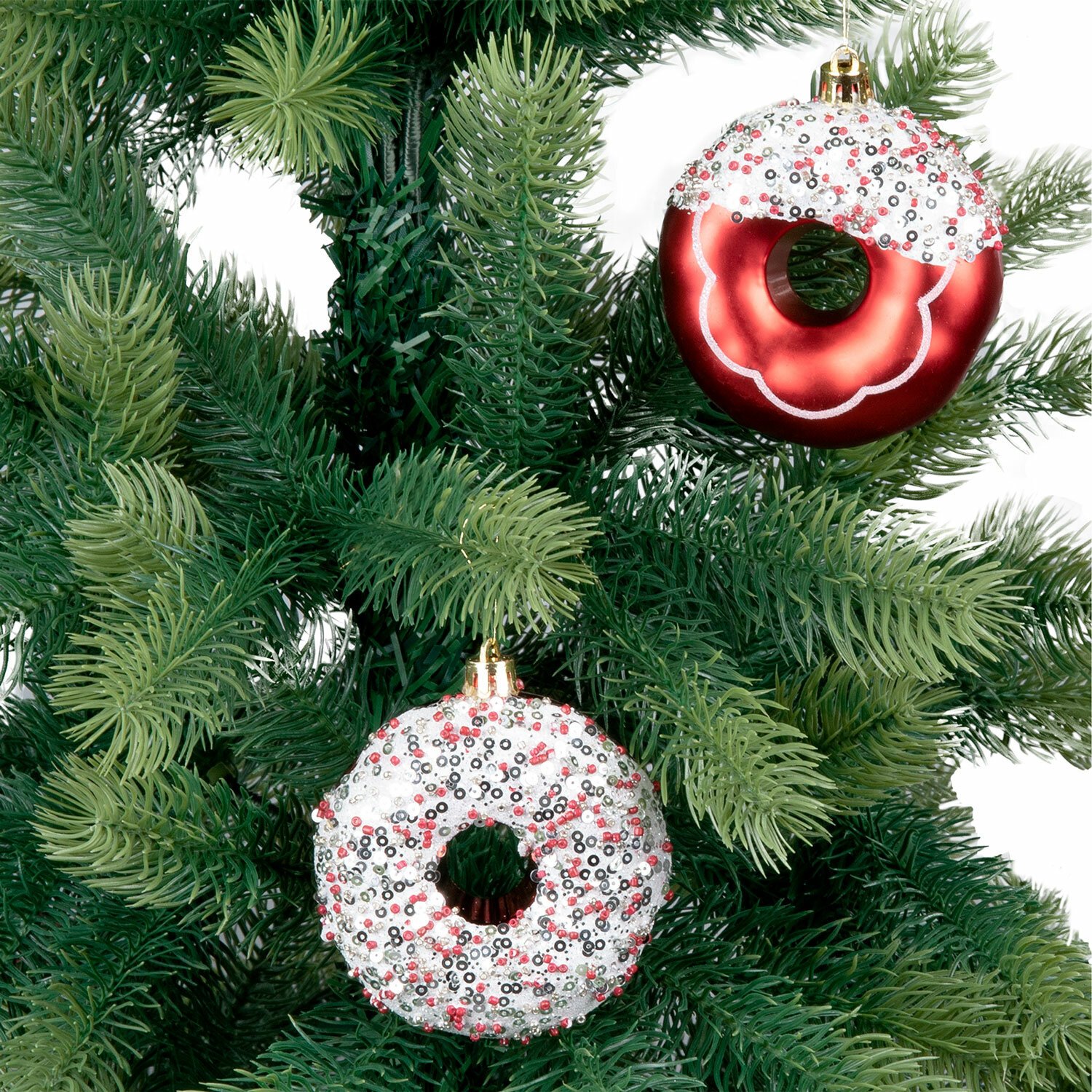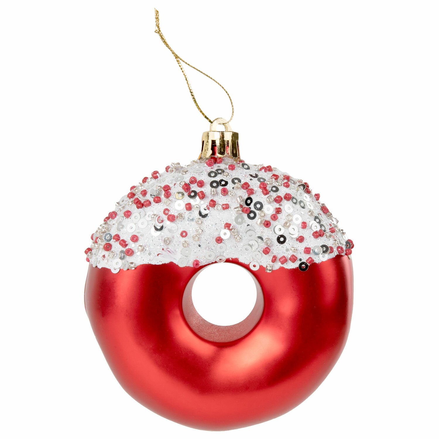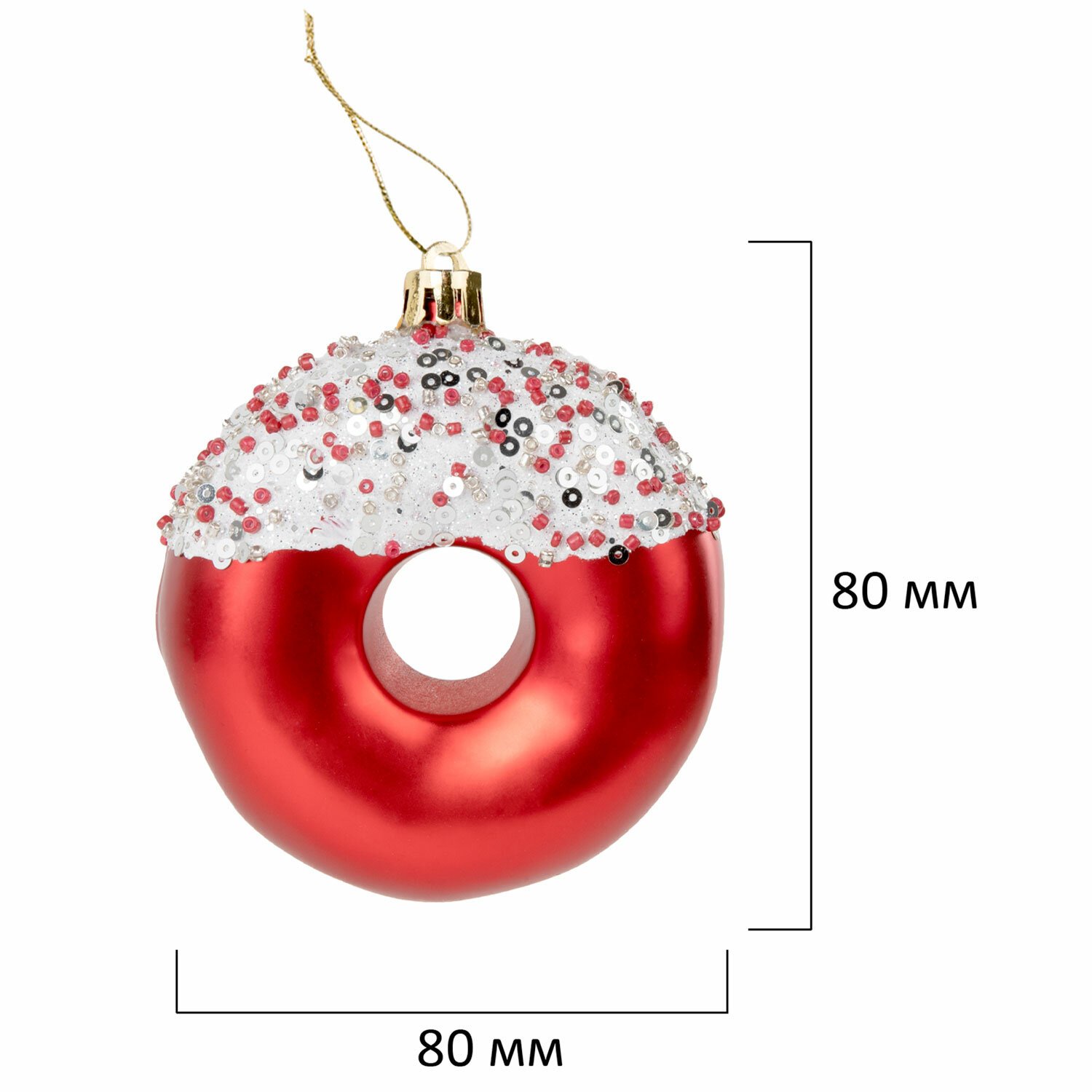 3 елочных украшения диаметром 8 см в виде пончика красного цвета в белой глазури с цветной посыпкой, с матовым эффектом и блестками, а также 6 нитей из полиэстера золотистого цвета длиной 30 см для подвешивания.