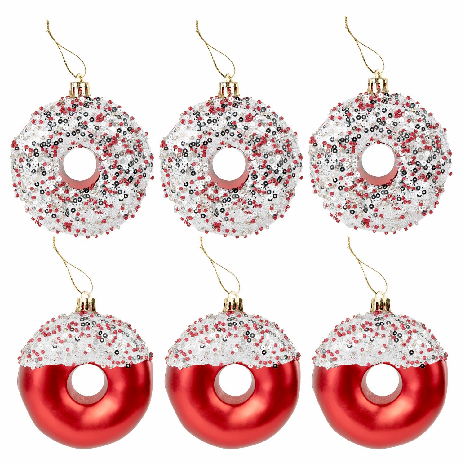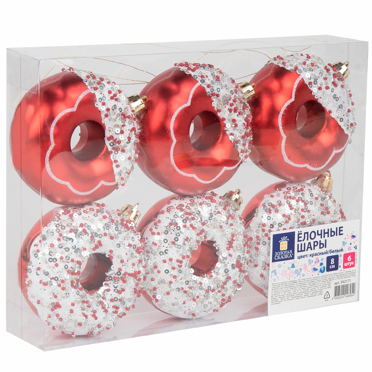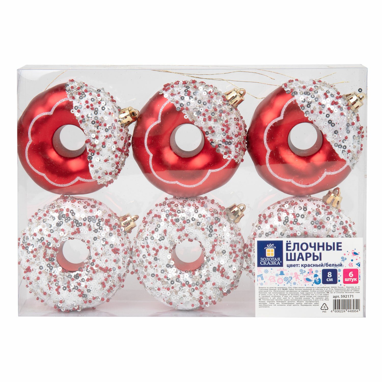 Украшение ёлочное 6 шт., 8 см, "Пончики", красный/белый, пластик, ЗОЛОТАЯ СКАЗКА, 592171