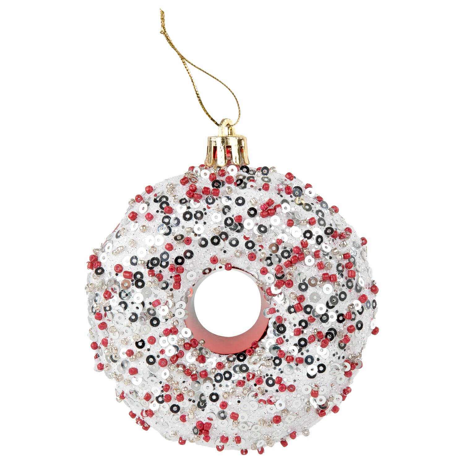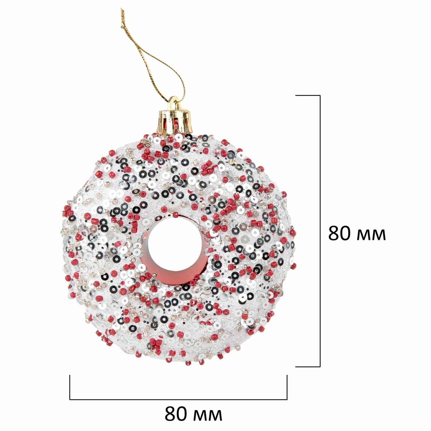 3 елочных украшения диаметром 8 см в виде пончика в белой глазури с цветной посыпкой, с матовым эффектом и блестками,