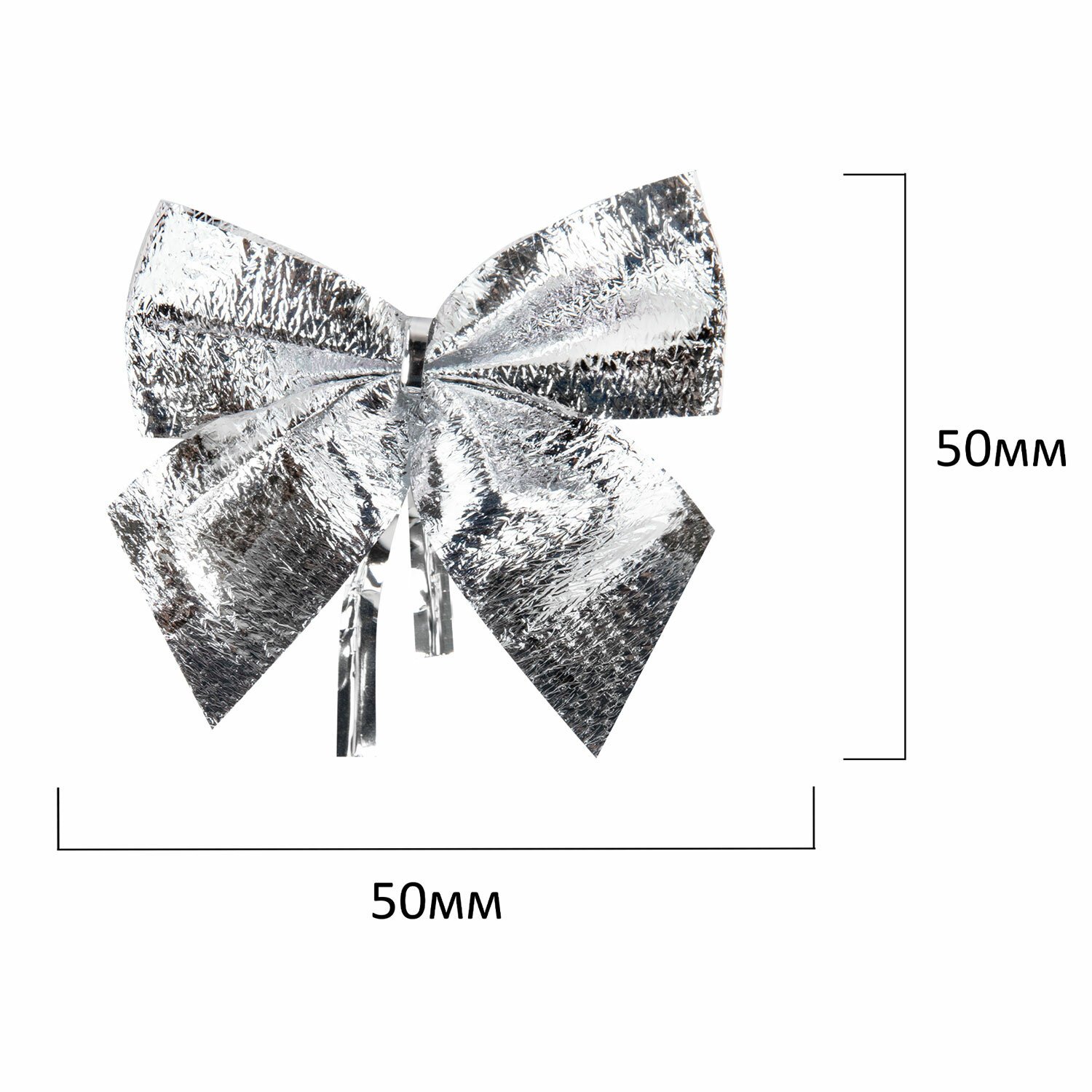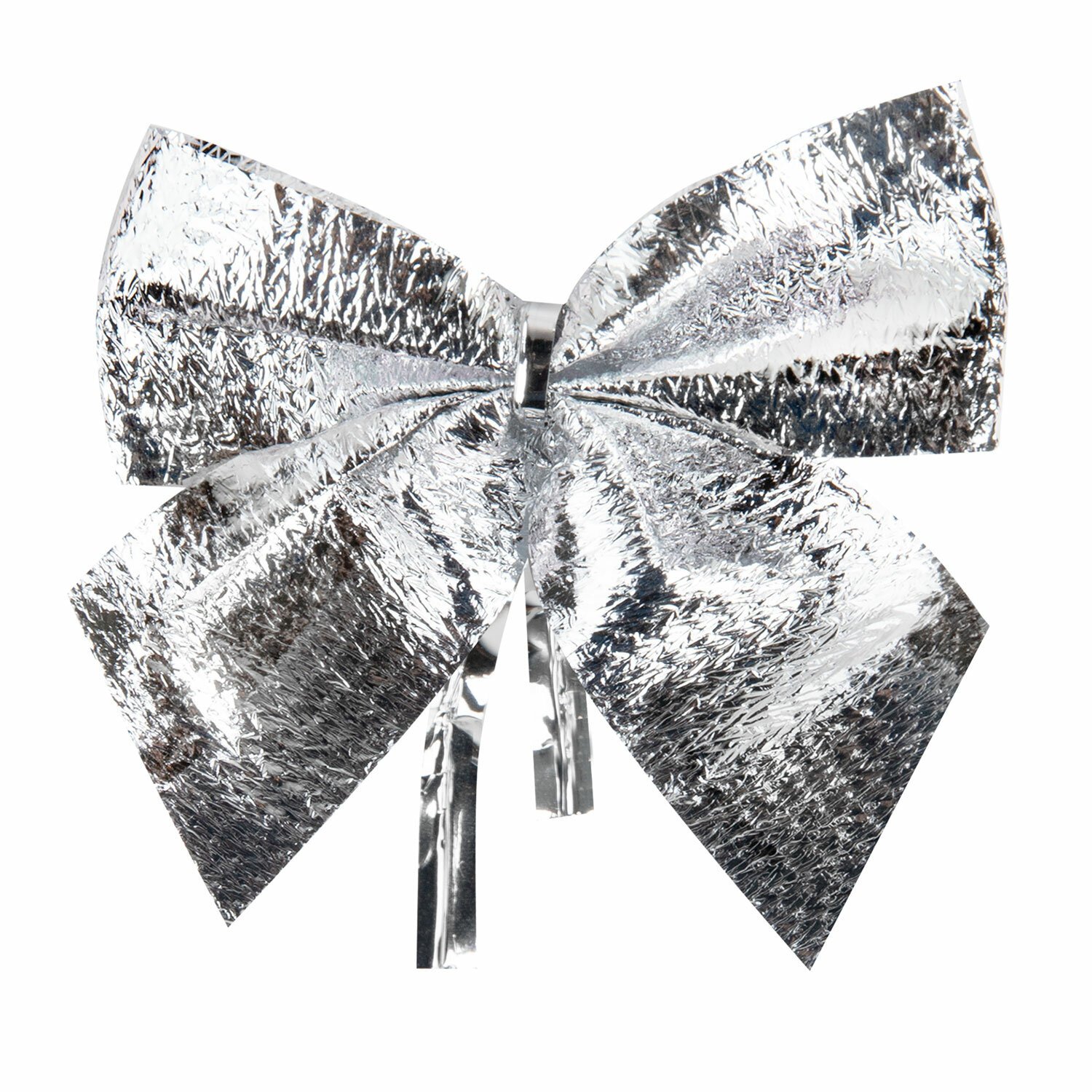 В наборе 24 бантика серебристого цвета. Размер украшений - 5x5 см. Материал - полиэстер. Упакованы в пакет с европодвесом.