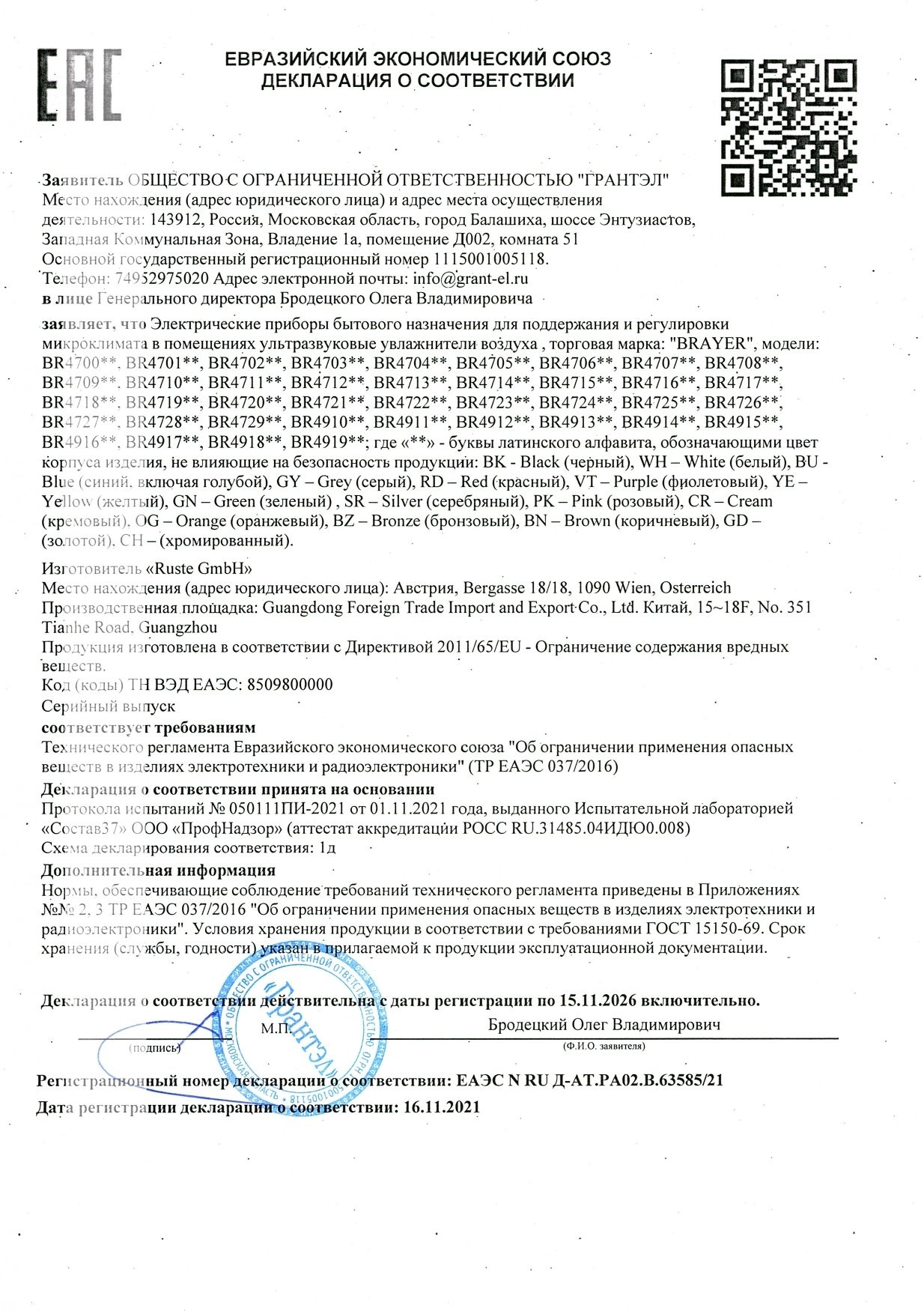 Увлажнитель воздуха BRAYER BR4702, объем бака 6 л, 25 Вт, арома-контейнер, белый