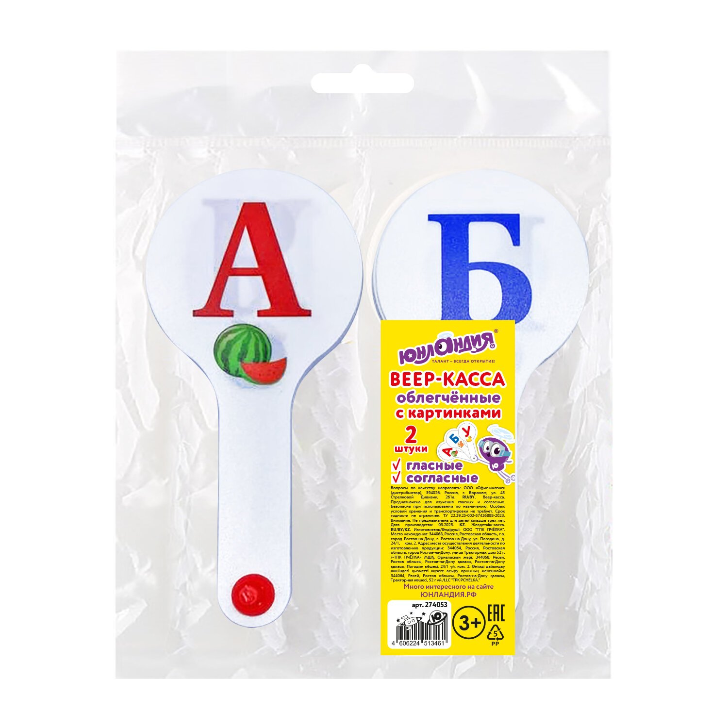 Веер-касса с картинками (гласные, согласные) ОБЛЕГЧЕННЫЕ, гибкие, НАБОР 2шт, ЮНЛАНДИЯ, 274053