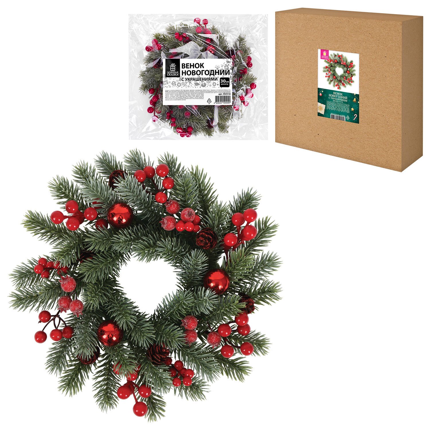 Венок новогодний, диаметром 30 см представляет собой конструкцию из пластикового каркаса и закрепленных к нему ветвей.