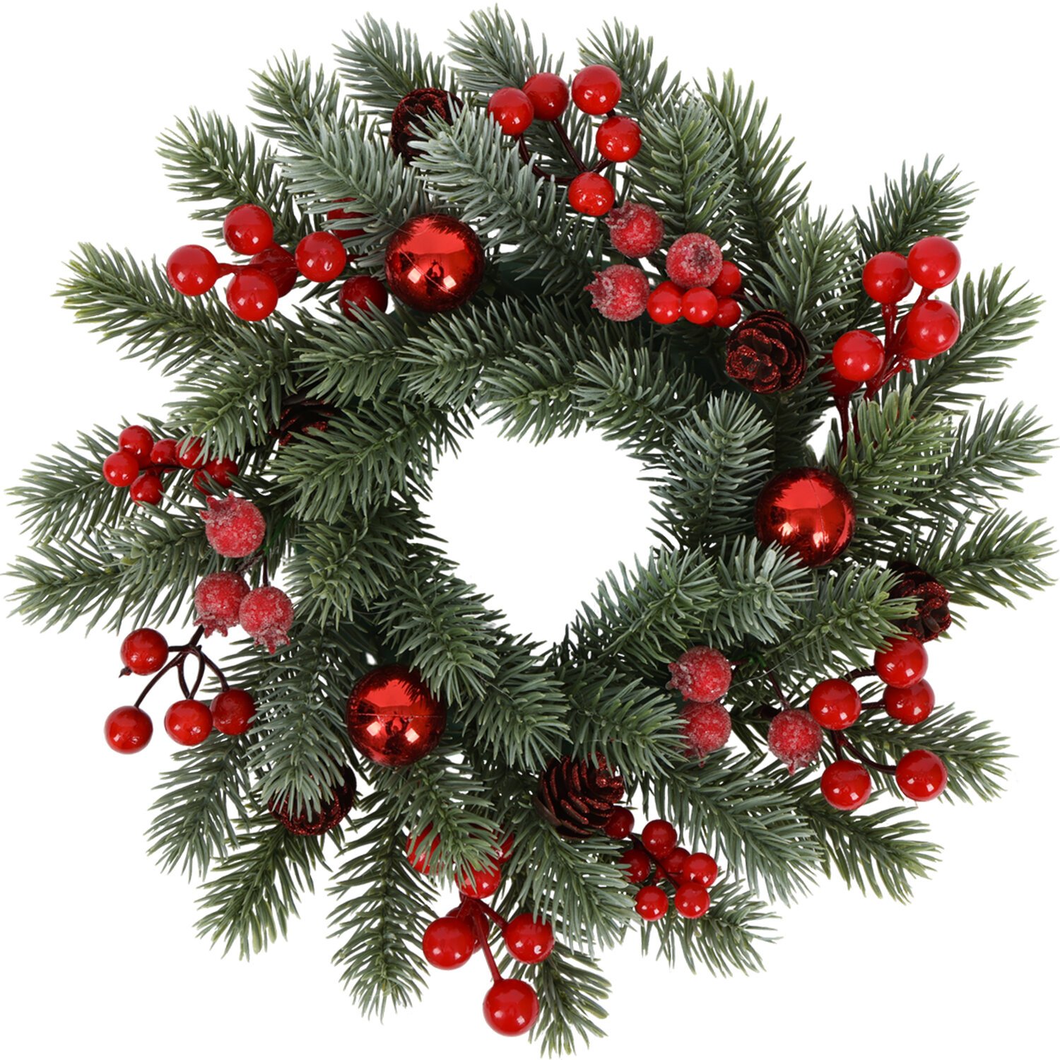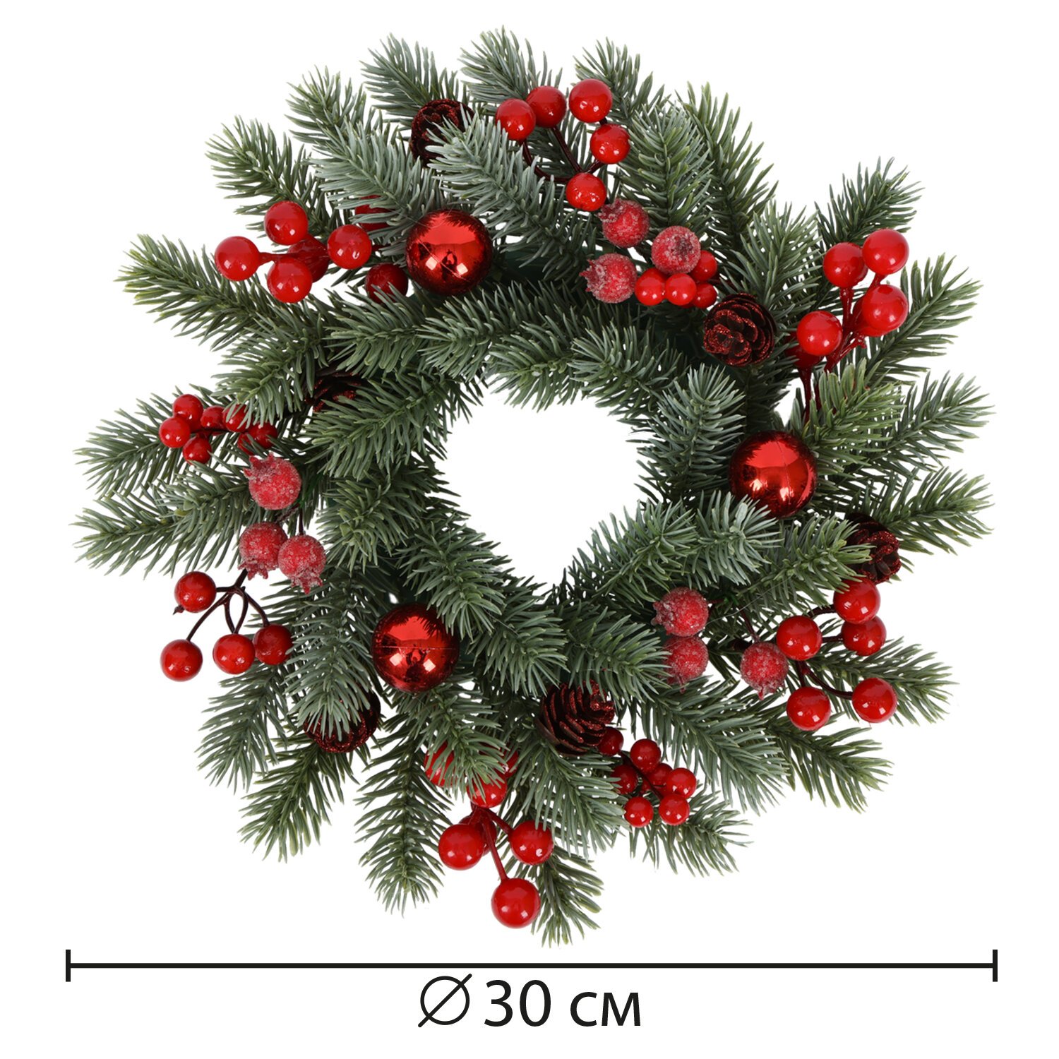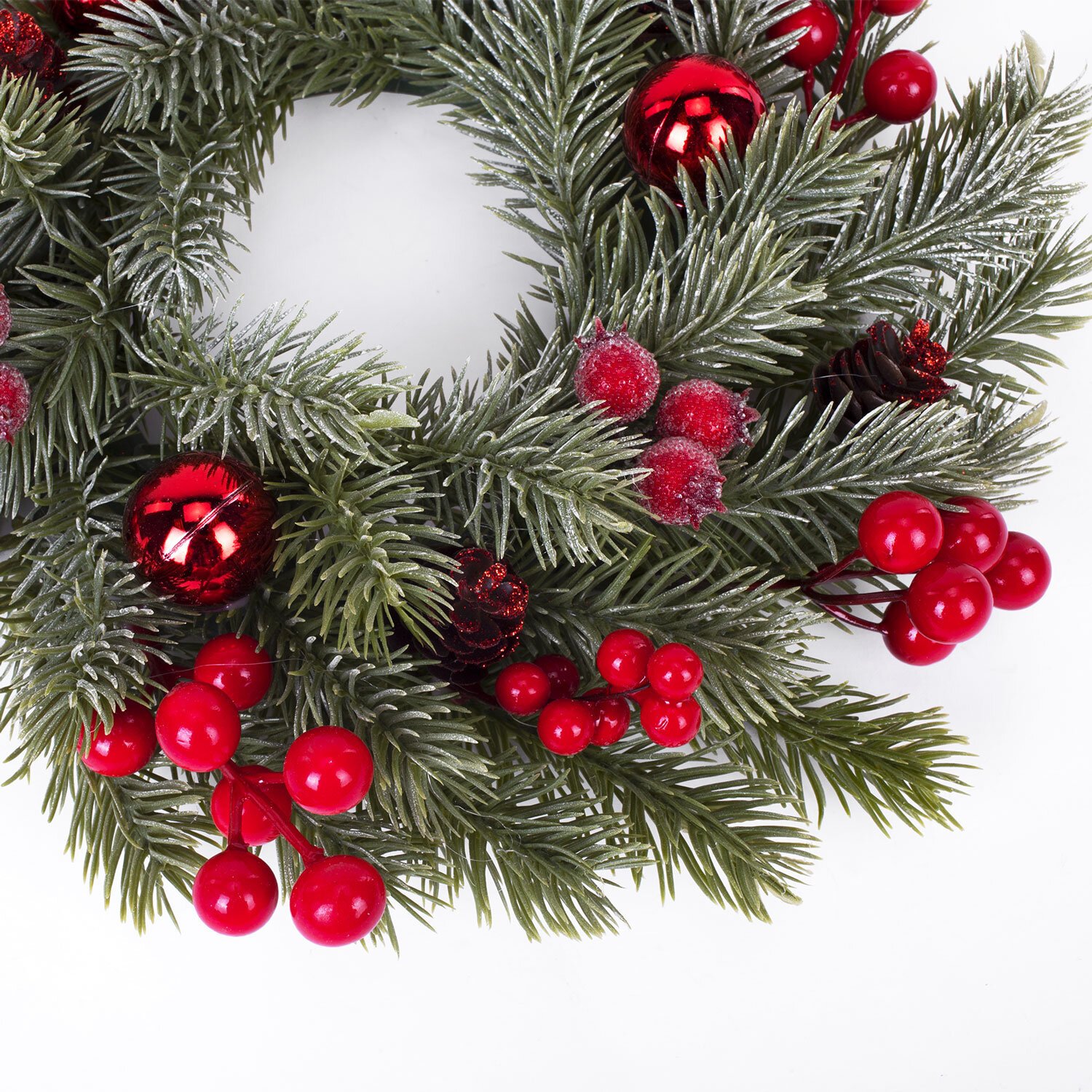 Материал – 100% литой ПЭТ. Цвет хвои – зелёный, заснеженный. Венок из литого ПЭТ, украшенный ветками красных ягодок, пластиковыми красными шарами и шишками, выглядит как натуральный и создает особую праздничную атмосферу. На задней части основания венка расположено отверстие, за которое можно легко повесить венок на стену или дверь. Можно разместить не только на вертикальную, но и горизонтальную поверхность, сделав частью новогоднего украшения и декорации.