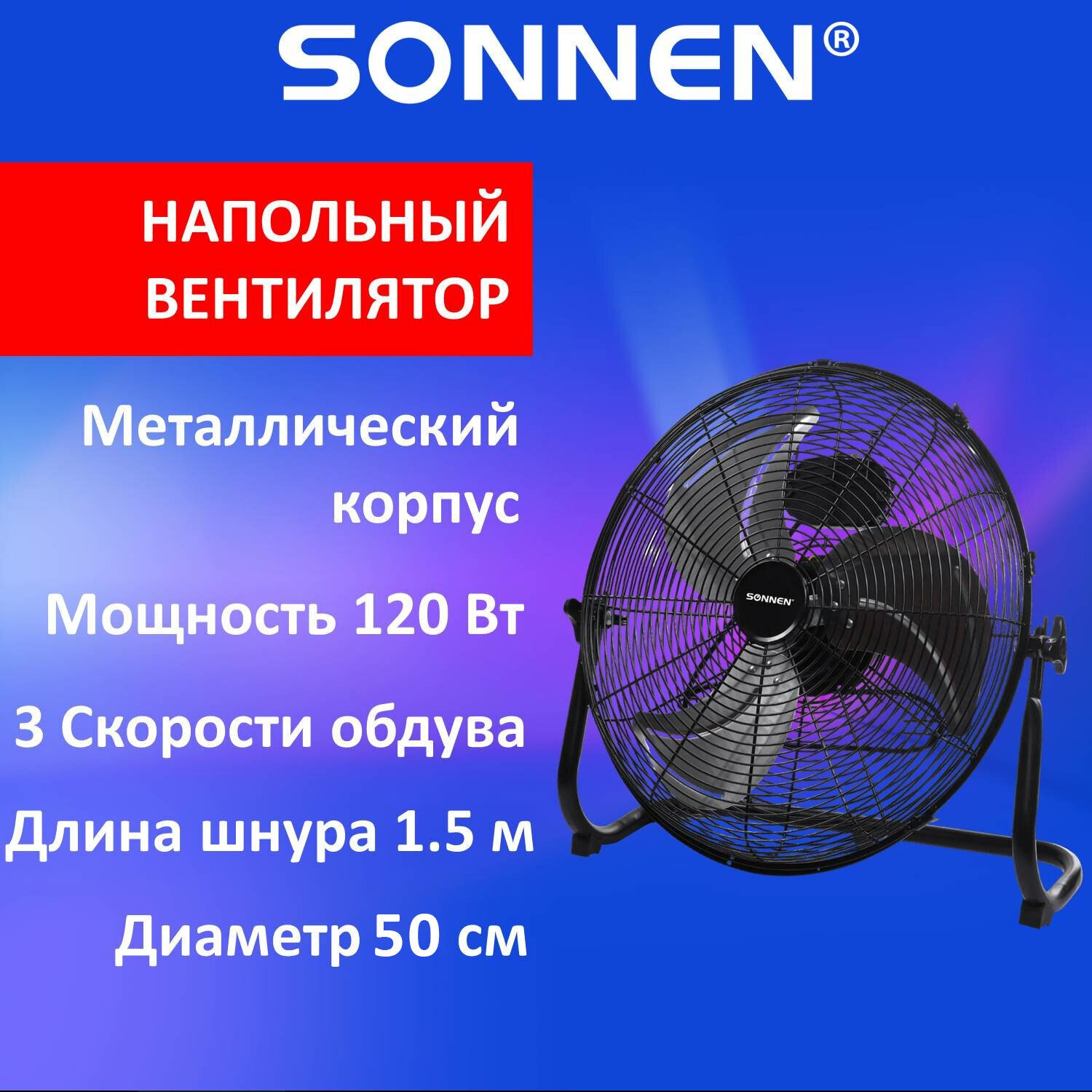 Вентилятор повышенной мощности SONNEN FE-45A обладает электромотором мощностью 120 Ватт, чем сильно выделяется на фоне классических напольных вентиляторов.
