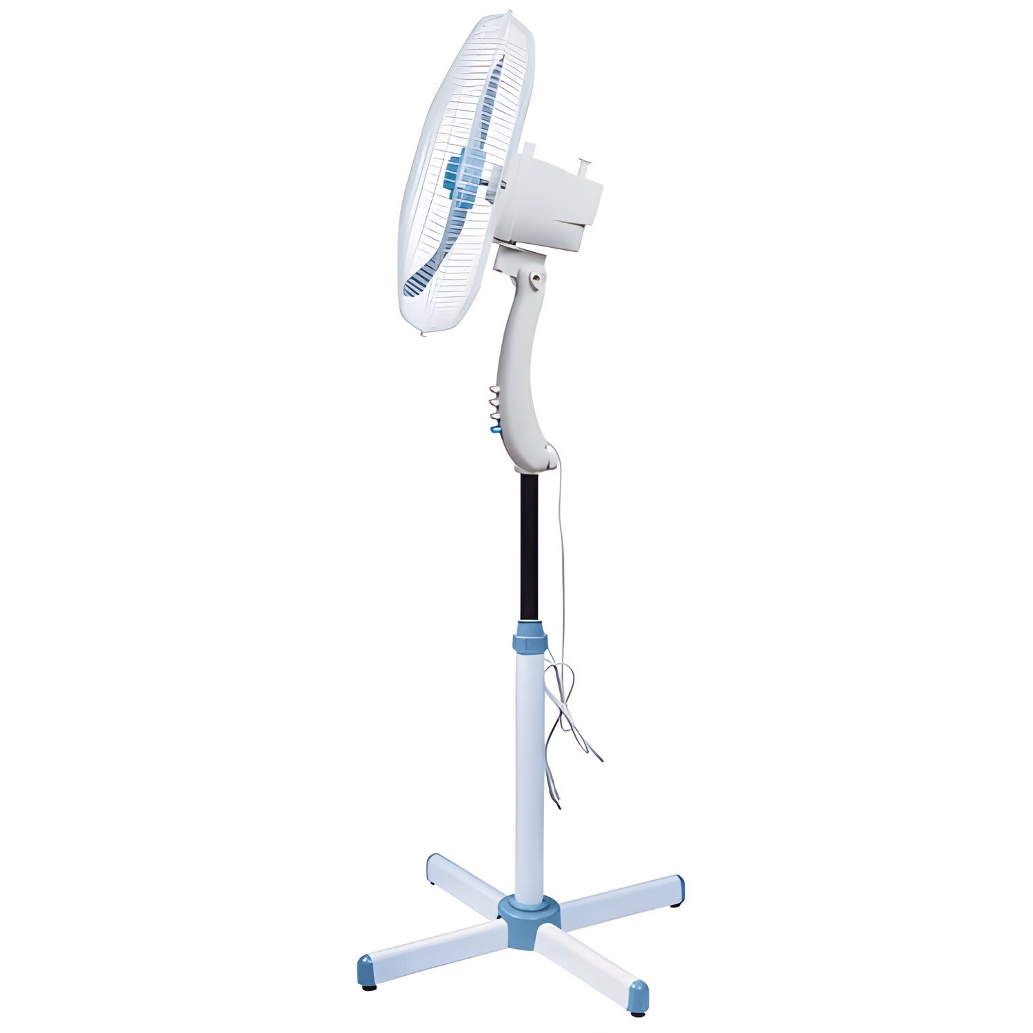 Высота просто и удобно регулируется с помощью специального механизма. Лопасти вентилятора диаметром 37 см закрыты защитной решеткой. Устойчивость обеспечивается подставкой размером 52х52 см. Вес вентилятора – 2,2 кг, максимальная высота – 1,25 м.