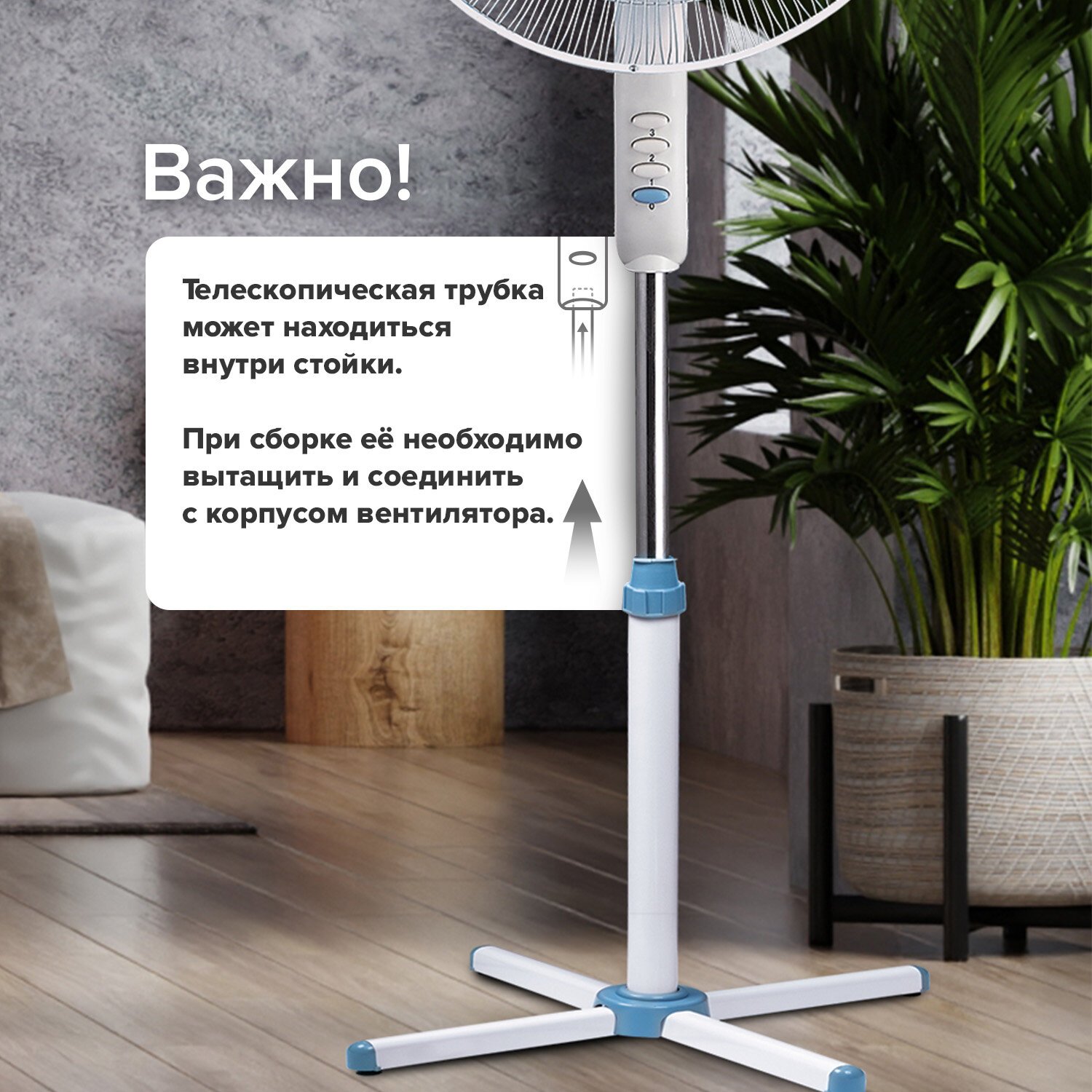 Электродвигатель мощностью 45 Вт обеспечивает стабильную работу. Наличие трех скоростей обдува позволит выбрать наиболее комфортный режим для пользователя. Вентилятор оснащен регулировкой воздушного потока в горизонтальной и вертикальной плоскости.