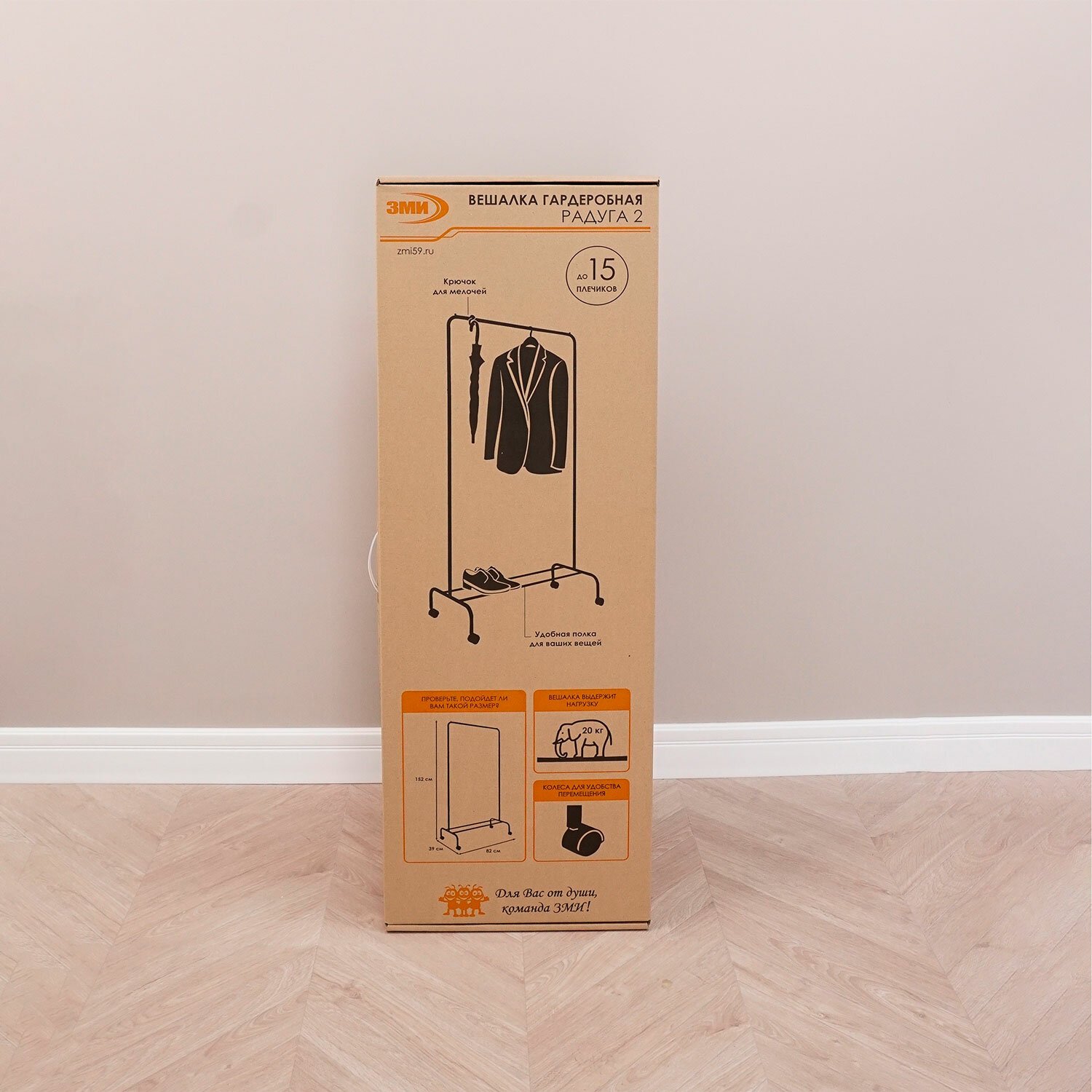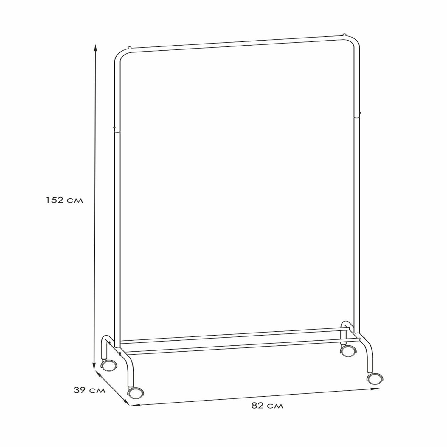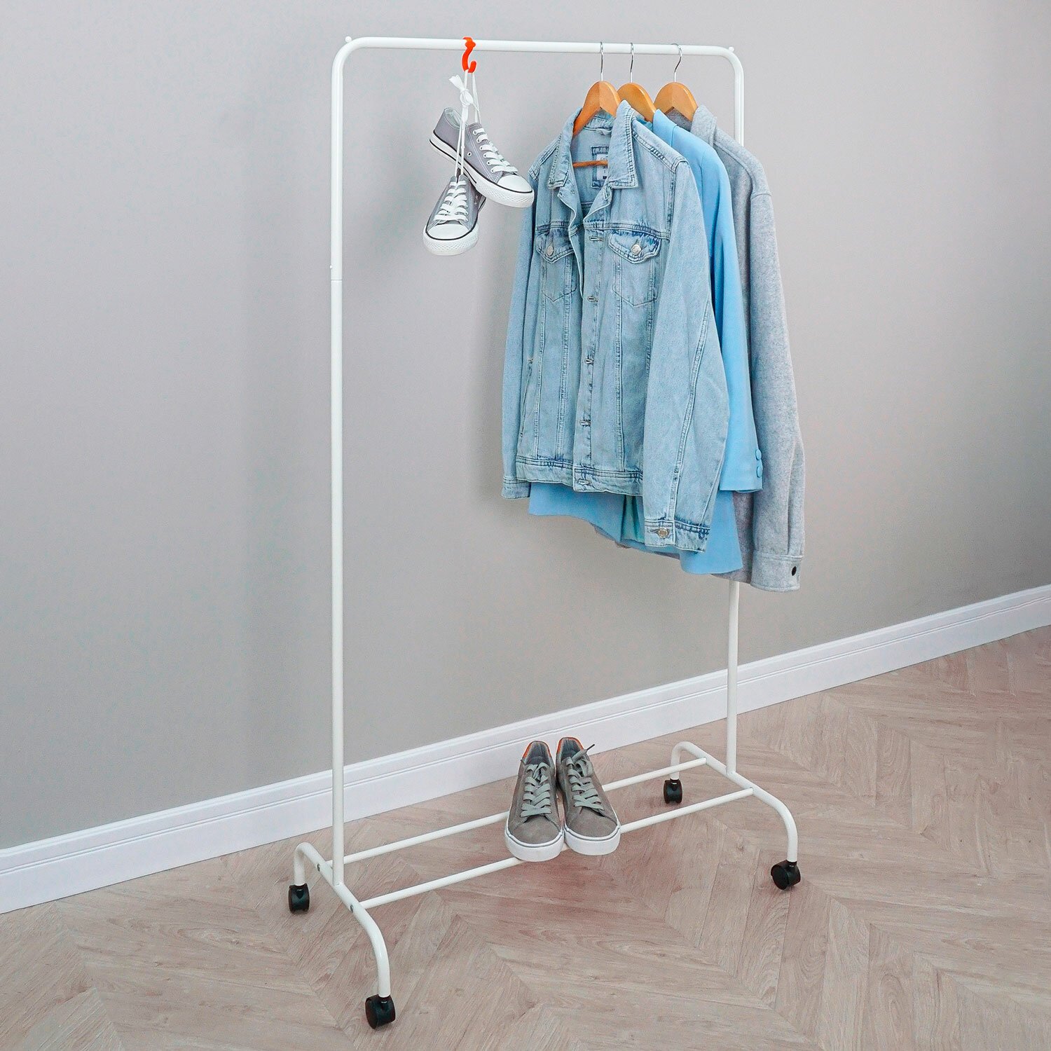 Железная перекладина вмещает до 15 плечиков, распределенная нагрузка — до 20 кг.