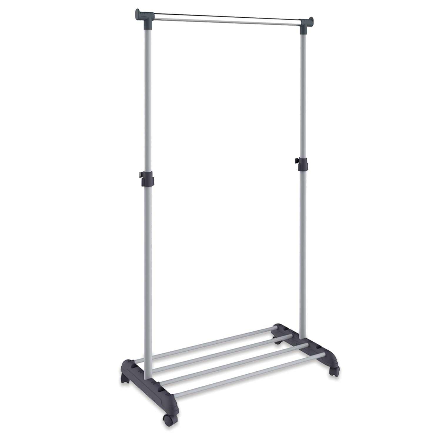 Многофункциональная передвижная гардеробная вешалка. Помимо традиционной штанги для плечиков, оснащена полками для обуви и боковыми крючками для сумок, зонтов и головных уборов. Имеет колесную опору.