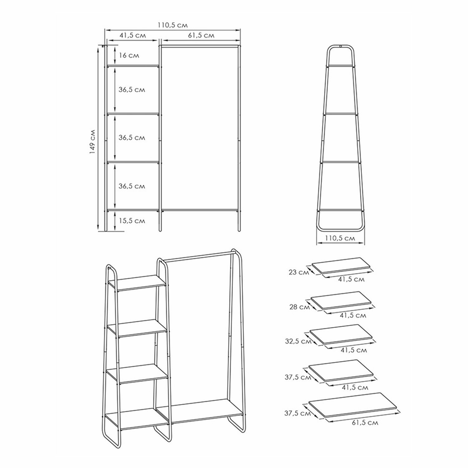 Пять прочных полок из ЛДСП, распределенная нагрузка на полку – до 10 кг.