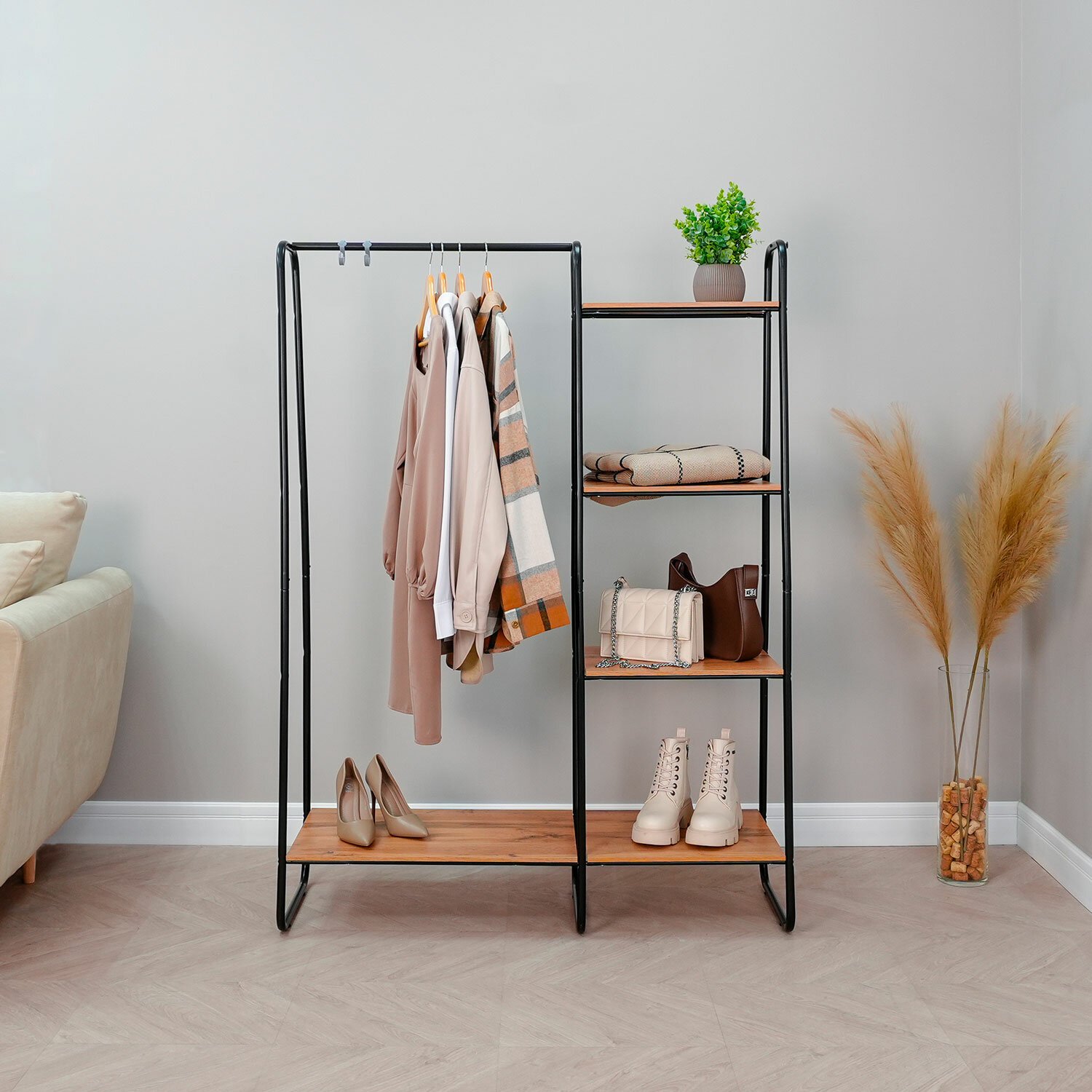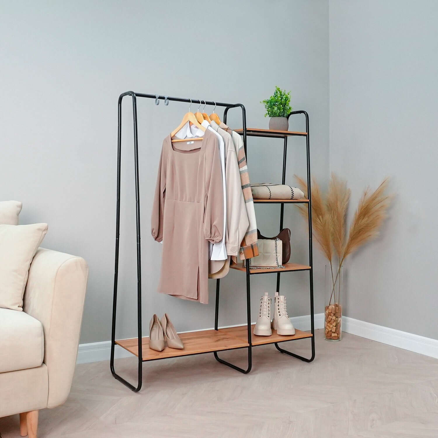 Практичная и функциональная гардеробная система "Скандинавия" — универсальное решение для компактного хранения в любом пространстве: дома, в офисе или торговом зале. Ее стильный дизайн дополнит интерьер, добавляя нотки современности и элегантности.