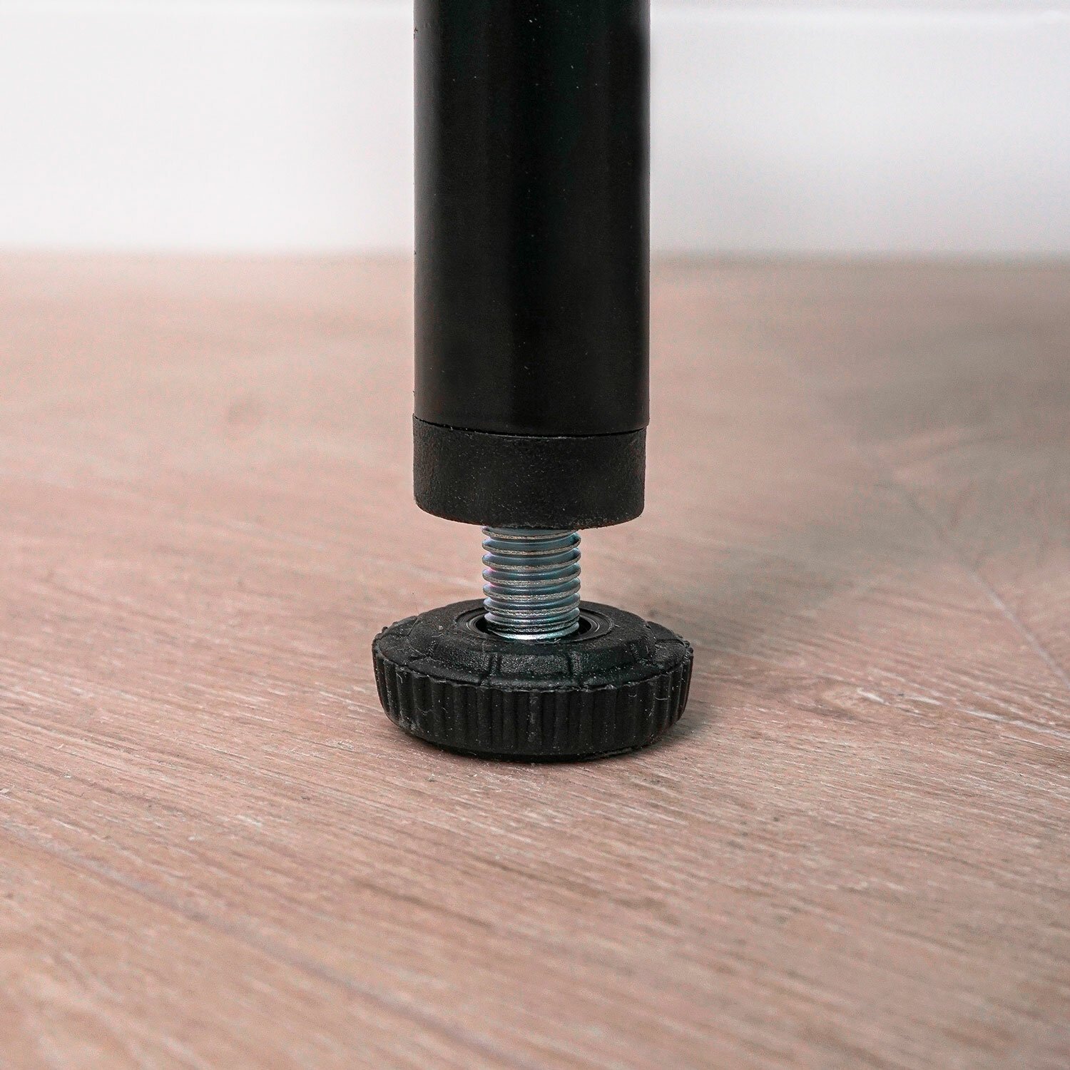 Стеллаж выполнен из прочной металлической трубы диаметром 18 мм и стального листа в мелкую сетку.