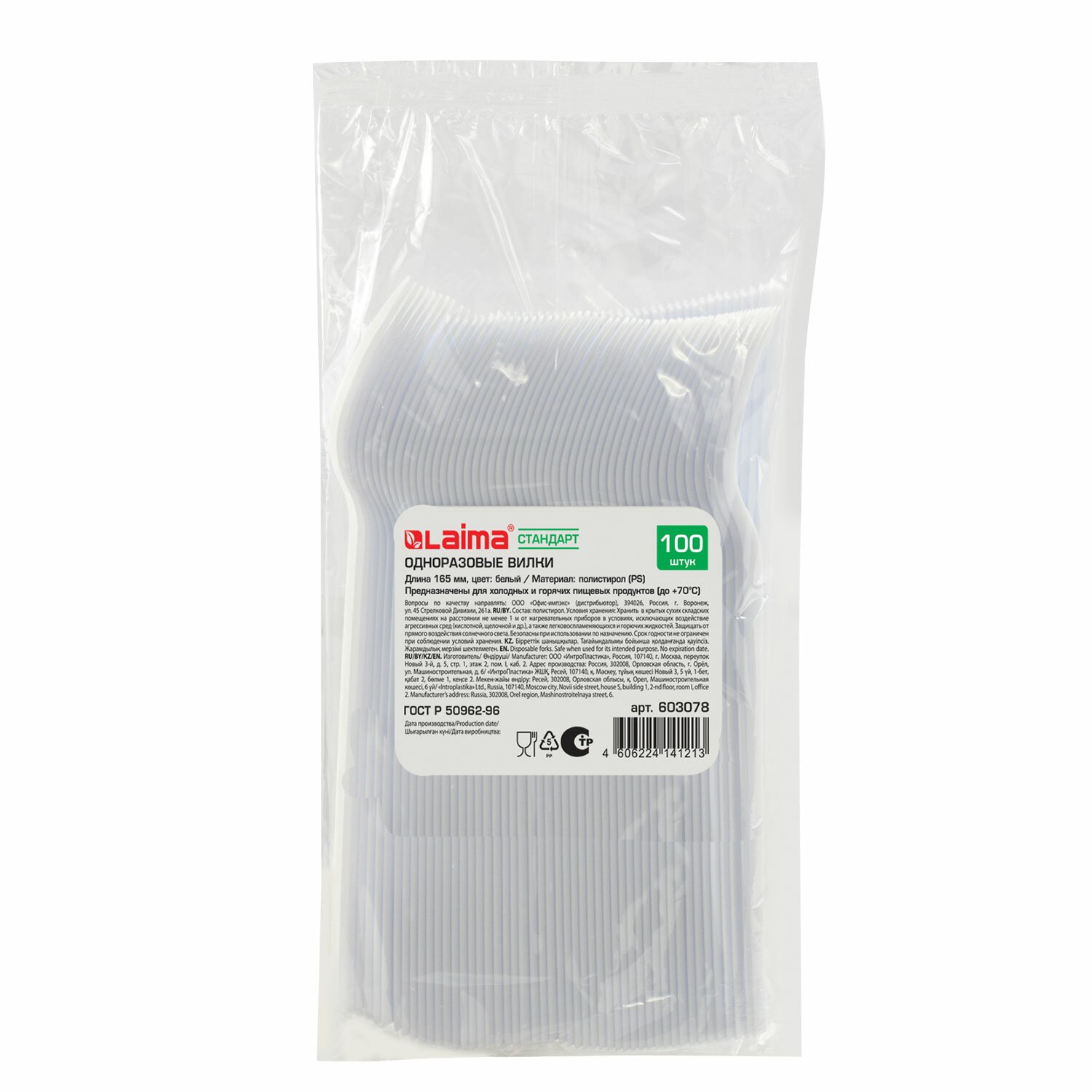 Вилка одноразовая пластиковая 165 мм, белая, КОМПЛЕКТ 100 шт., СТАНДАРТ, LAIMA, 603078