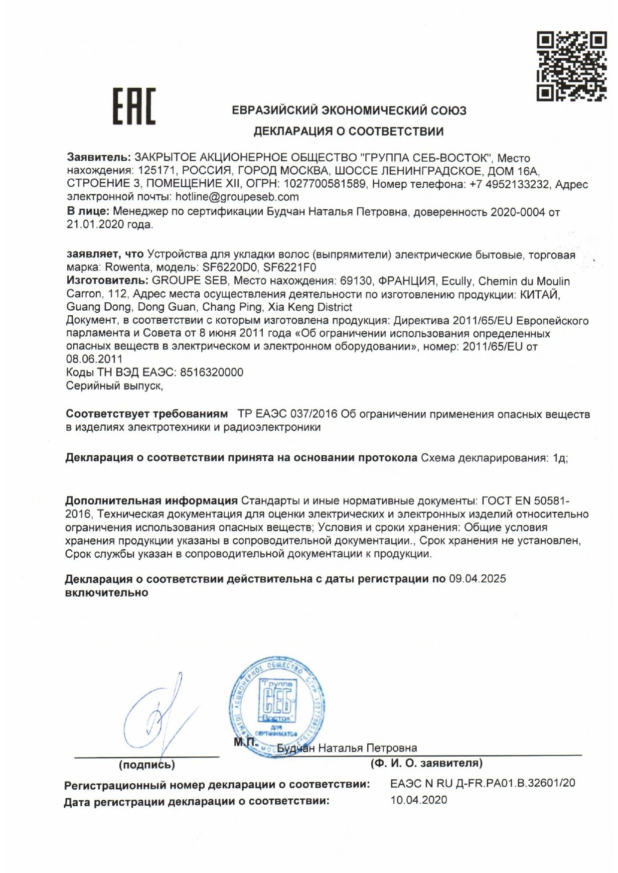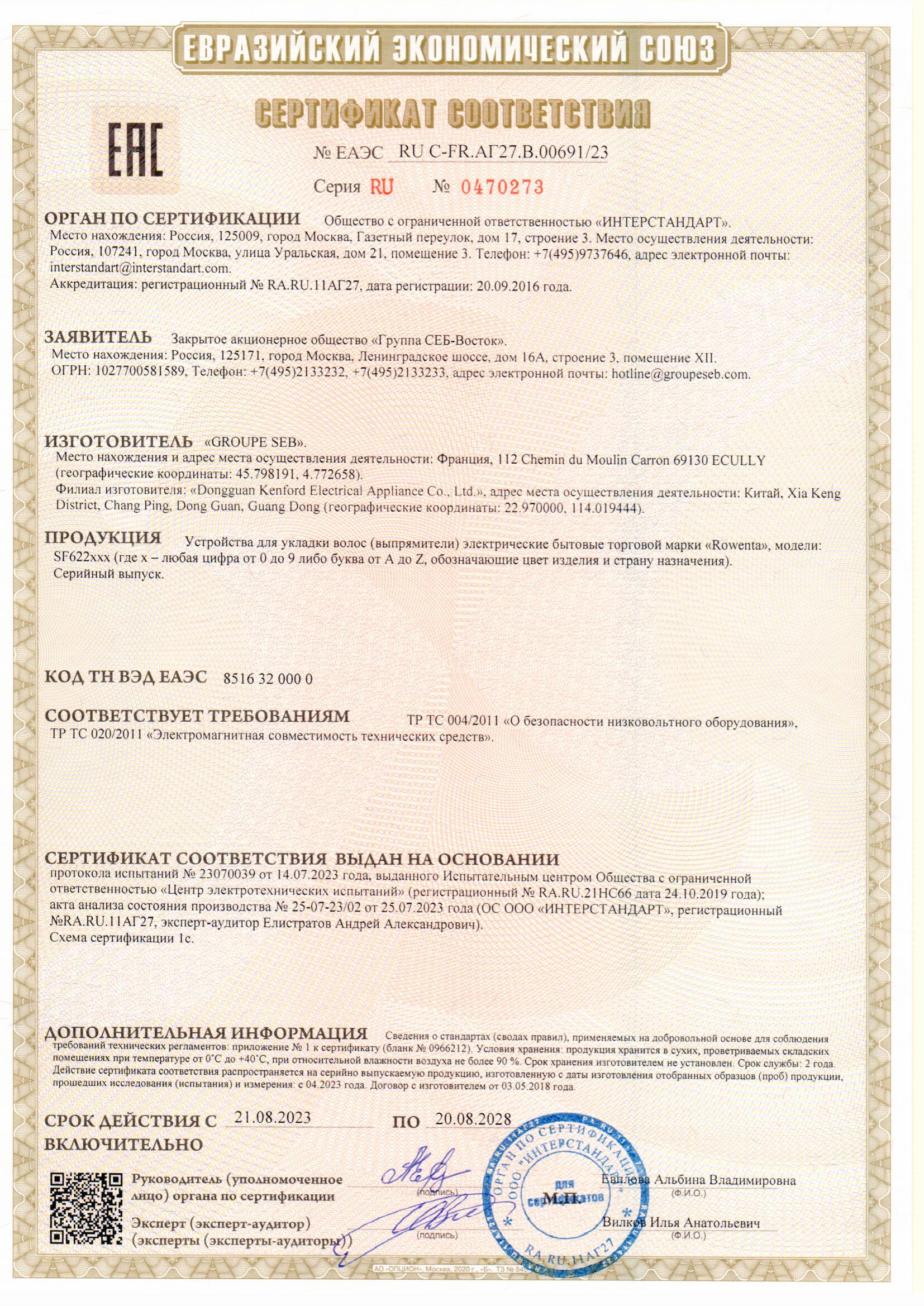 Выпрямитель для волос ROWENTA SF6220D0, 5 режимов нагрева, 130-230 °С, керамика, черный, 1830005680