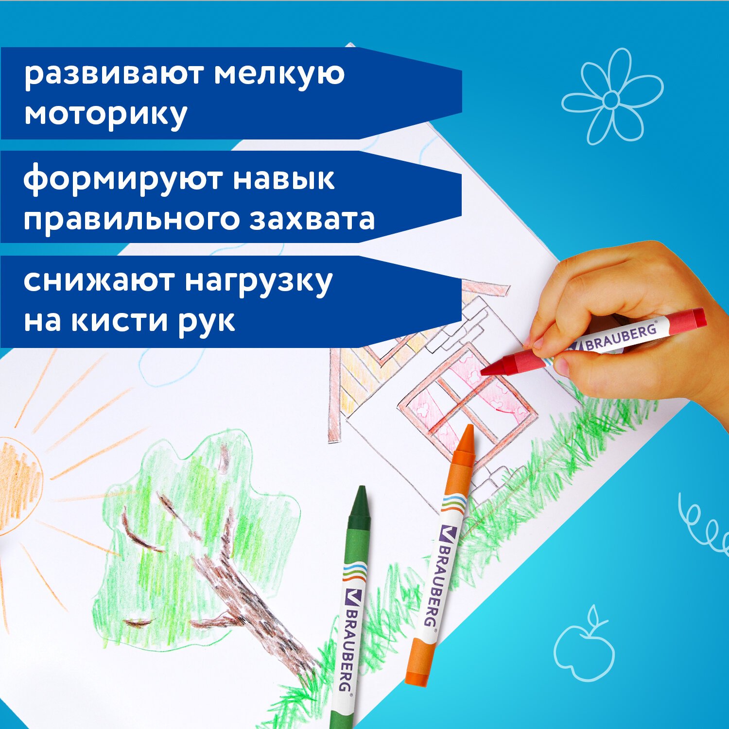 Рисование восковыми мелками BRAUBERG способствует развитию мелкой моторики рук, воображения и помогает формировать цветовое восприятие. Идеальны для рисования на бумаге любого типа, а также дереве, картоне и стекле.