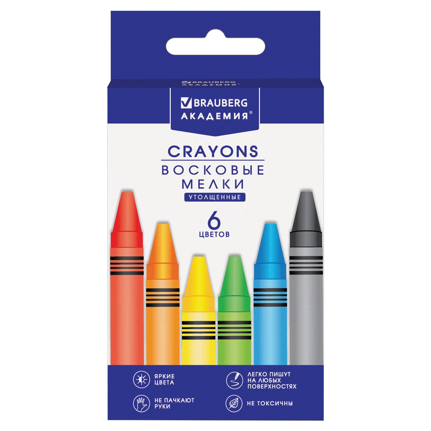 Восковые мелки трехгранные утолщенные BRAUBERG "АКАДЕМИЯ", НАБОР 6 цветов, 227286