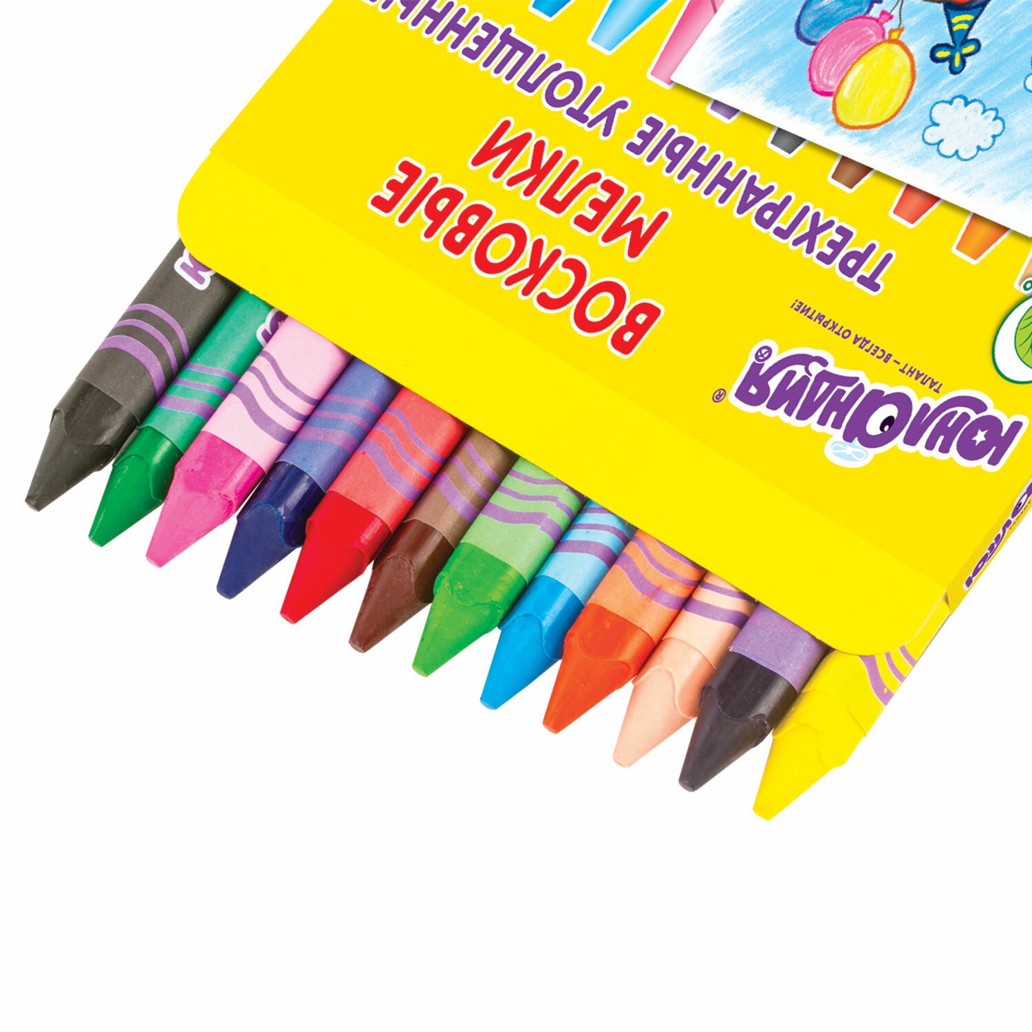 Палитра состоит из 12 ярких и насыщенных цветов. Полностью безопасны в использовании, не токсичны и не имеют резкого запаха. Благодаря своему составу мелки пишут мягко, и ребенку не придется прикладывать усилия в процессе рисования. Утолщенная трехгранная форма корпуса и диаметр 11 мм делают их еще более удобными для тренировки руки к письму у дошкольников и детей младшего школьного возраста, формируют навык правильного захвата, снижают нагрузку на кисти рук. Каждый мелок завернут в бумажную этикетку, что предохраняет от загрязнений, снижает скольжение, увеличивает прочность. Восковые мелки упакованы в картонную коробку с европодвесом.