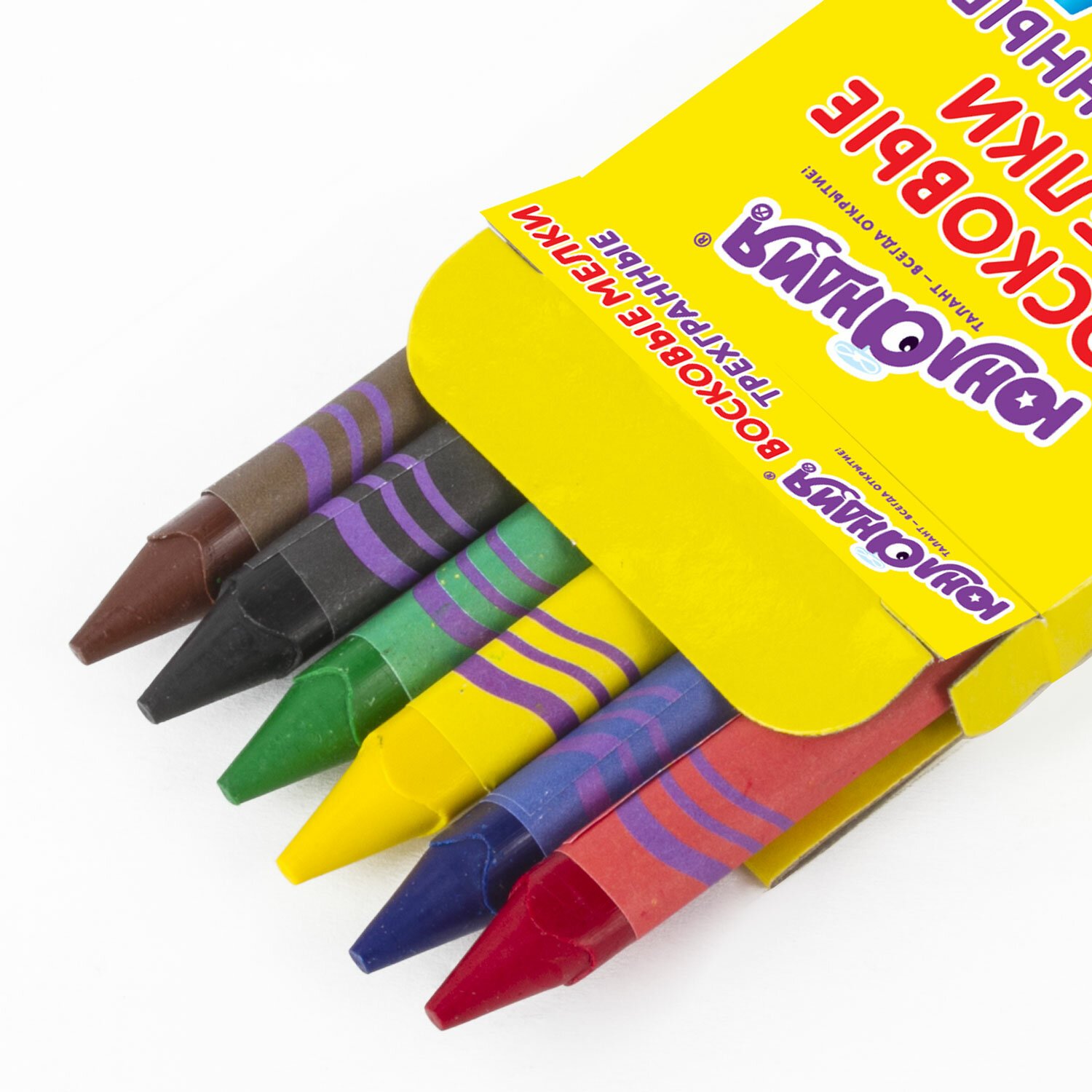 Палитра состоит из 6 ярких и насыщенных цветов. Полностью безопасны в использовании, не токсичны и не имеют резкого запаха. Благодаря своему составу мелки пишут мягко, и ребенку не придется прикладывать усилия в процессе рисования. Трехгранная форма корпуса и диаметр 8 мм делают их удобными для тренировки руки к письму у дошкольников и детей младшего школьного возраста, формируют навык правильного захвата, снижают нагрузку на кисти рук. Каждый мелок завернут в бумажную этикетку, что предохраняет от загрязнений, снижает скольжение, увеличивает прочность. Восковые мелки упакованы в картонную коробку с европодвесом.
