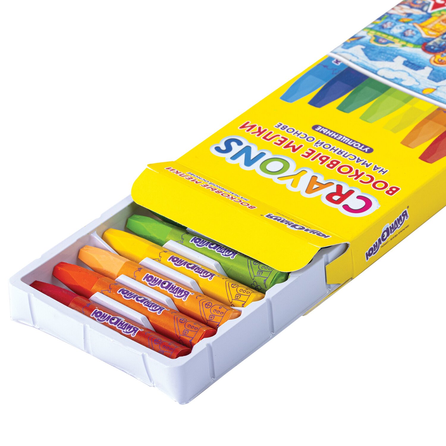 Восковые мелки ЮНЛАНДИЯ на масляной основе прекрасно подойдут для детей, начинающих свой творческий путь на бумаге любого типа, а также дереве, картоне и стекле. Незаменимы для дошкольников и детей младшего школьного возраста.