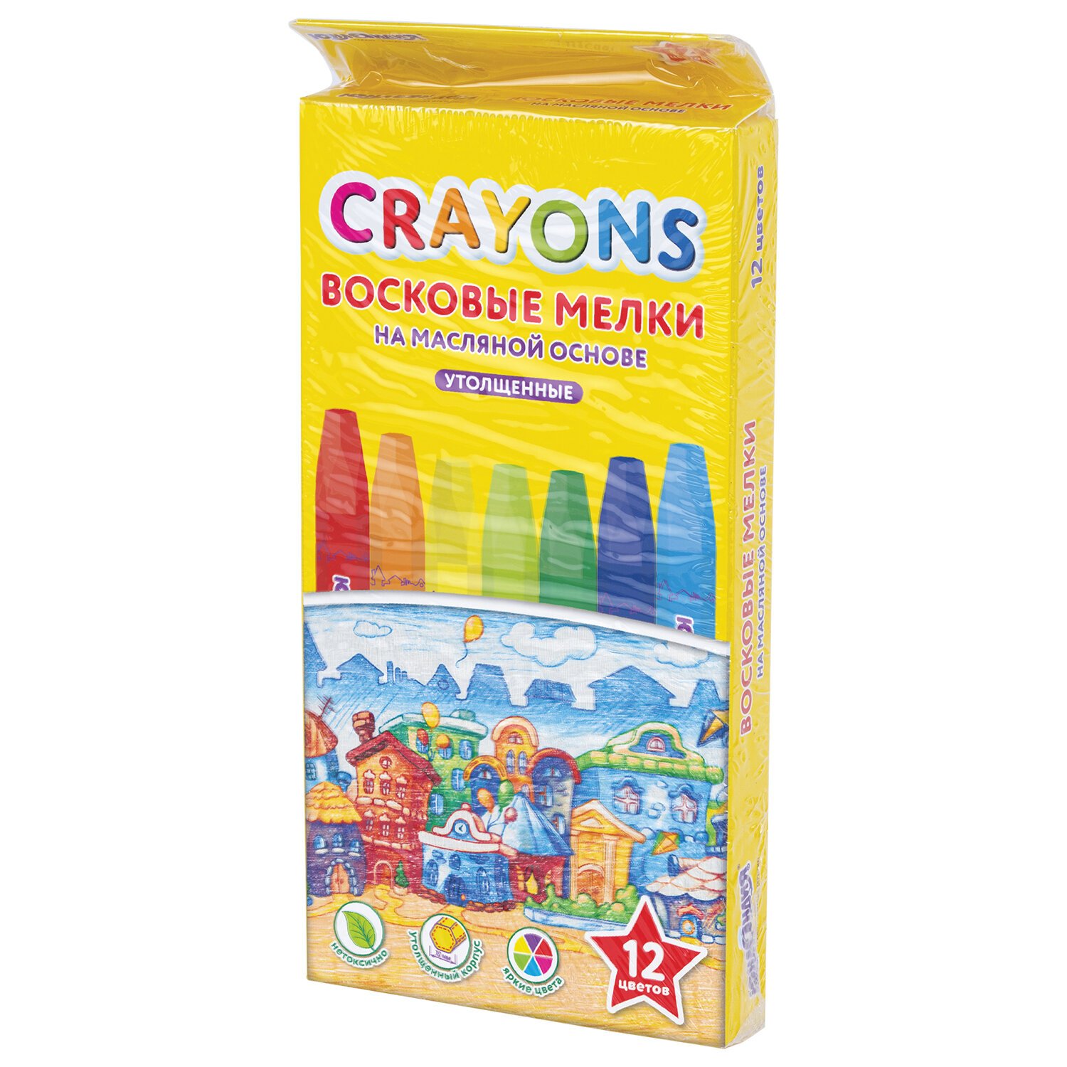 Палитра состоит из 12 ярких и насыщенных цветов. Полностью безопасны в использовании, не токсичны и не имеют резкого запаха. Благодаря своему составу карандаши пишут мягко, и ребенку не придется прикладывать усилия в процессе рисования. Утолщенная шестигранная форма корпуса и диаметр 10 мм делают их еще более удобными для тренировки руки к письму у детей, формируют навык правильного захвата, снижают нагрузку на кисти рук, отлично развивают мелкую моторику. Каждый карандаш завернут в бумажную этикетку, что предохраняет от загрязнений, снижает скольжение, увеличивает прочность. Восковые карандаши упакованы в картонную коробку с европодвесом и термоусадку.