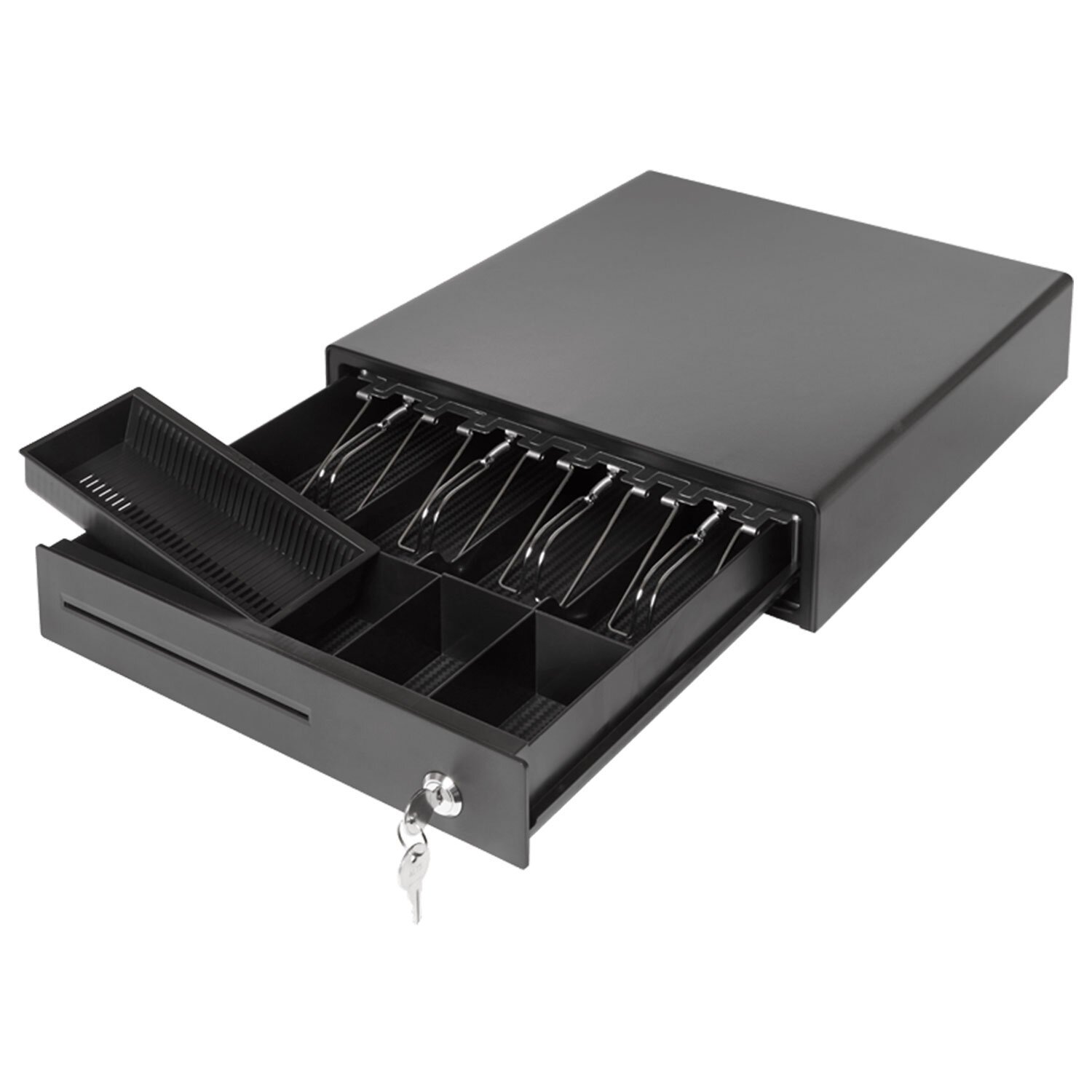 Горизонтальный денежный ящик содержит 8 внутренних отделений: 4 отсека с металлическими зажимами для купюр, 3 ячейки для монет, в том числе один широкий съёмный отсек. Дополнительное отделение для чеков и крупных купюр доступно с передней панели.