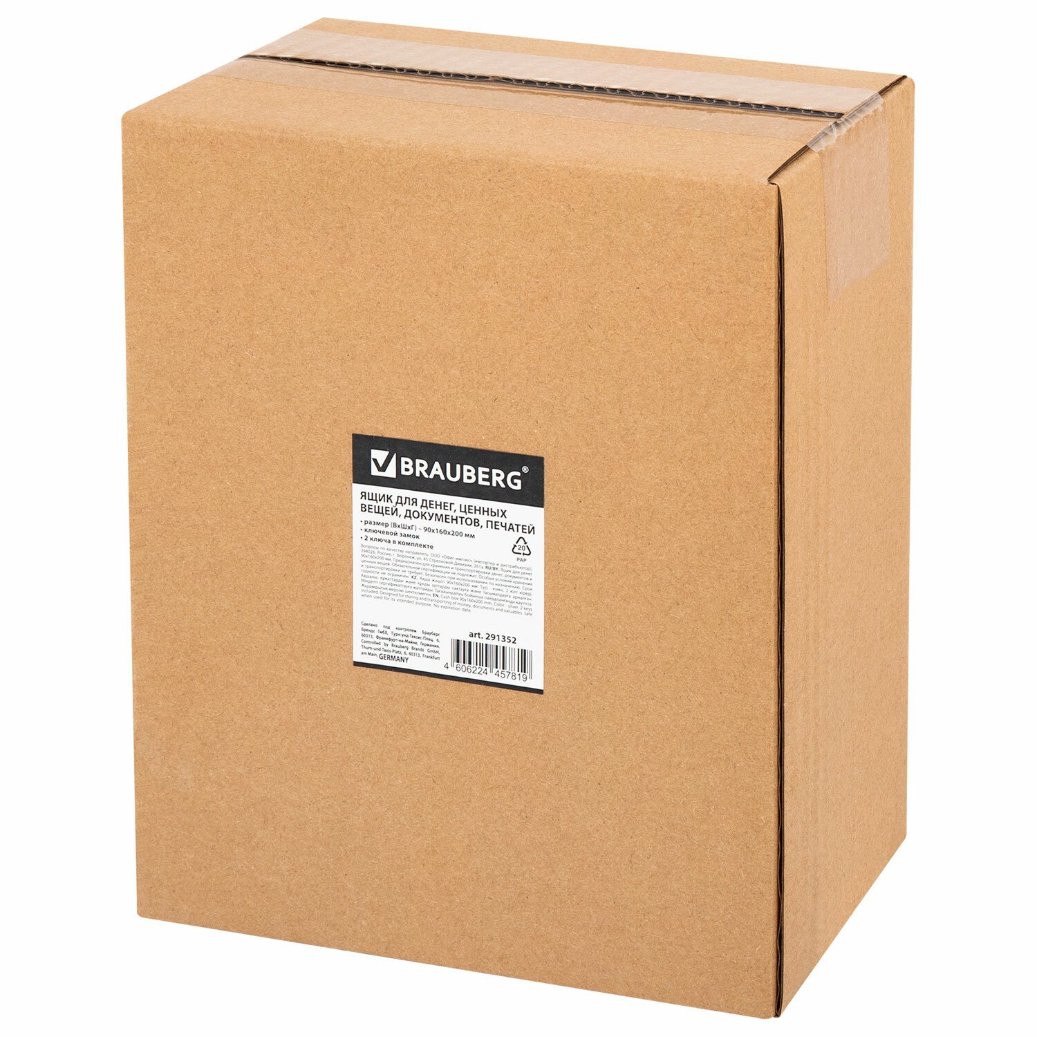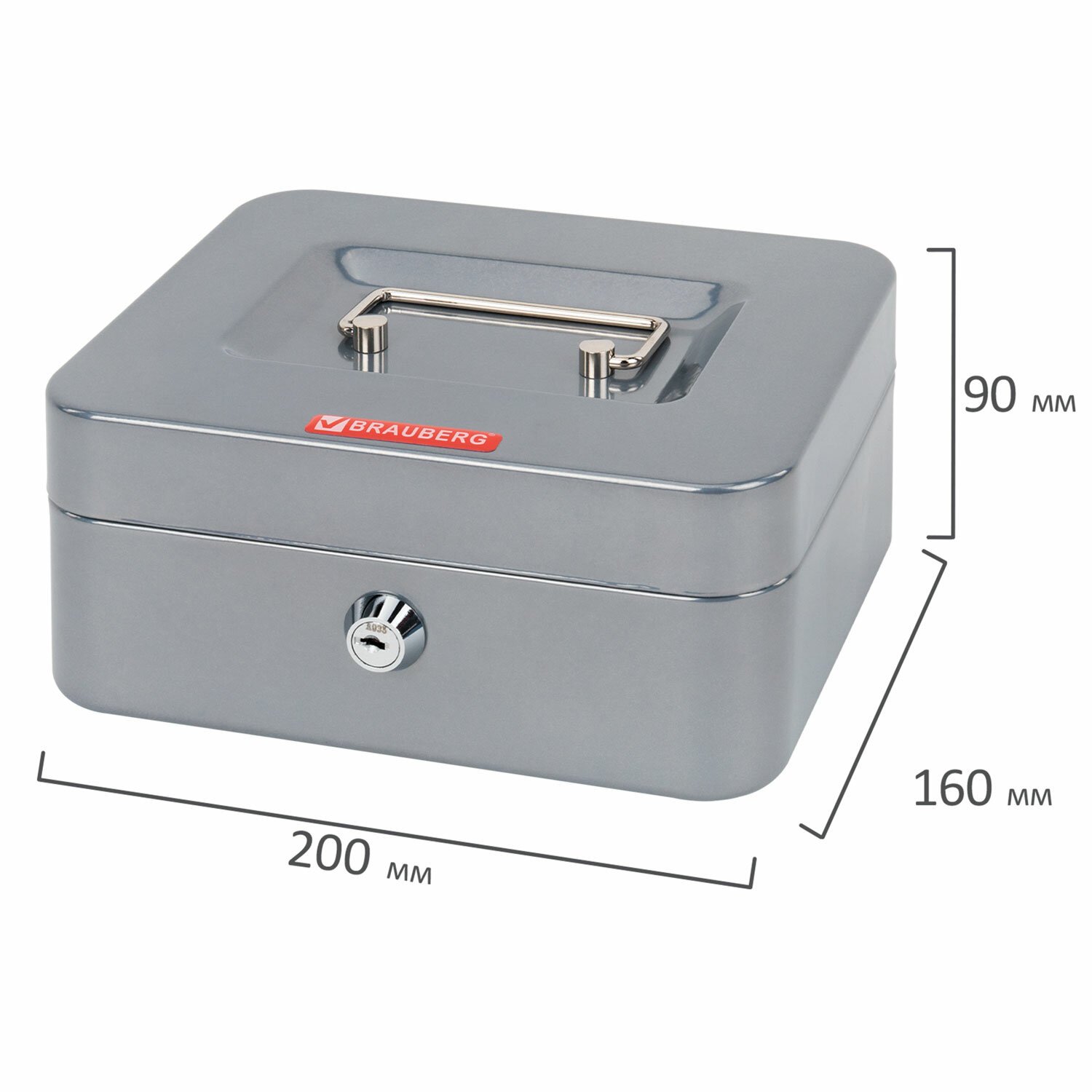 Ящик для денег, ценностей, документов, печатей, 90х160х200 мм, ключевой замок, серебристый, BRAUBERG, 291352