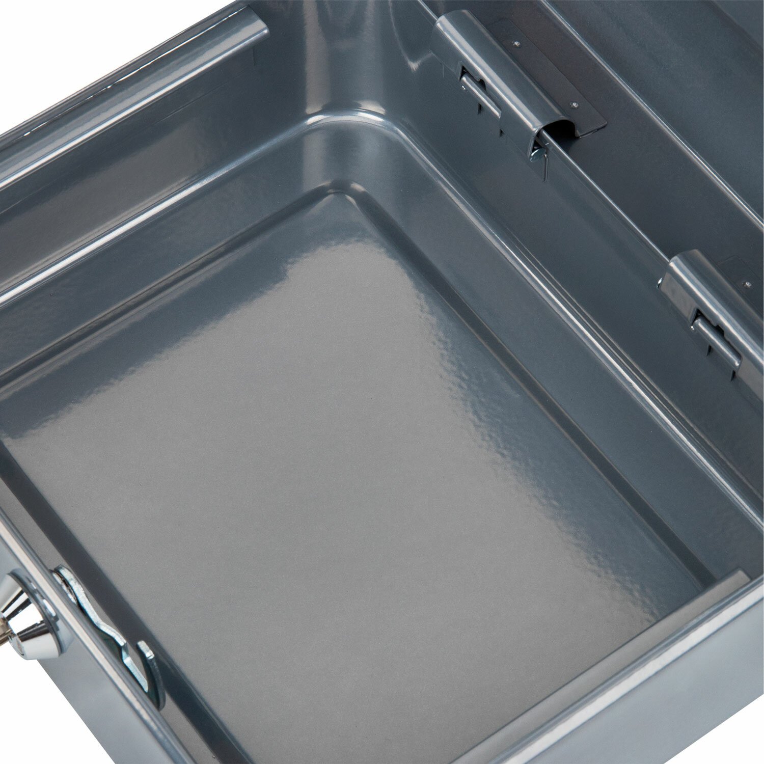 Изготовлен из стали. Надежный корпус с удобной ручкой выполнен в серебристом цвете. С ключевым замком, в комплекте 2 ключа. Размер - 90х160х200 мм.