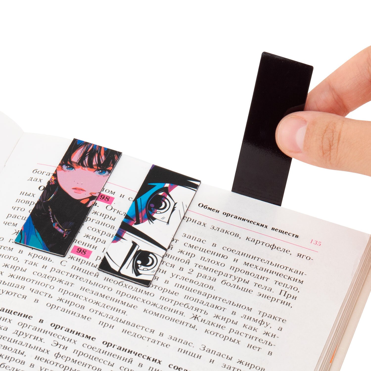 Закладки выполнены из картона и винила, надежно крепятся на листе благодаря магнитной полосе. Позволяют быстро найти нужную страницу. Удобны в применении и даже спустя большое количество времени будут выглядеть аккуратно. Размер закладки в сложенном виде - 60x20 мм. В наборе 12 штук. Яркие, красочные аниме-дизайны.