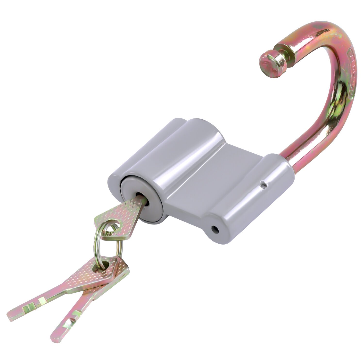 Замок навесной имеет алюминиевый корпус с пластиковым покрытием и оснащен полукруглой стальной дужкой. Тип механизма секретности – дисковый. Три дисковых ключа в комплекте. Замок запирается и открывается при помощи ключа.