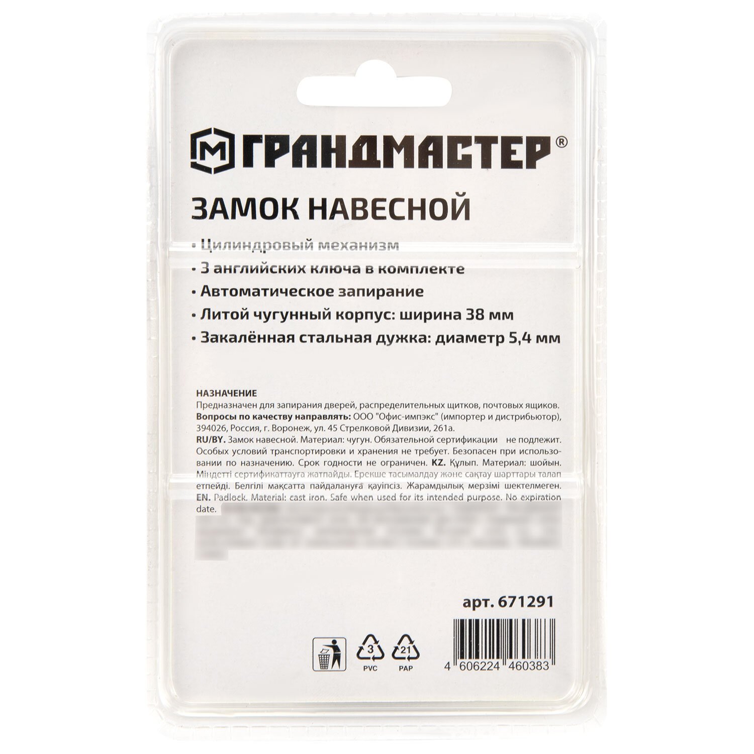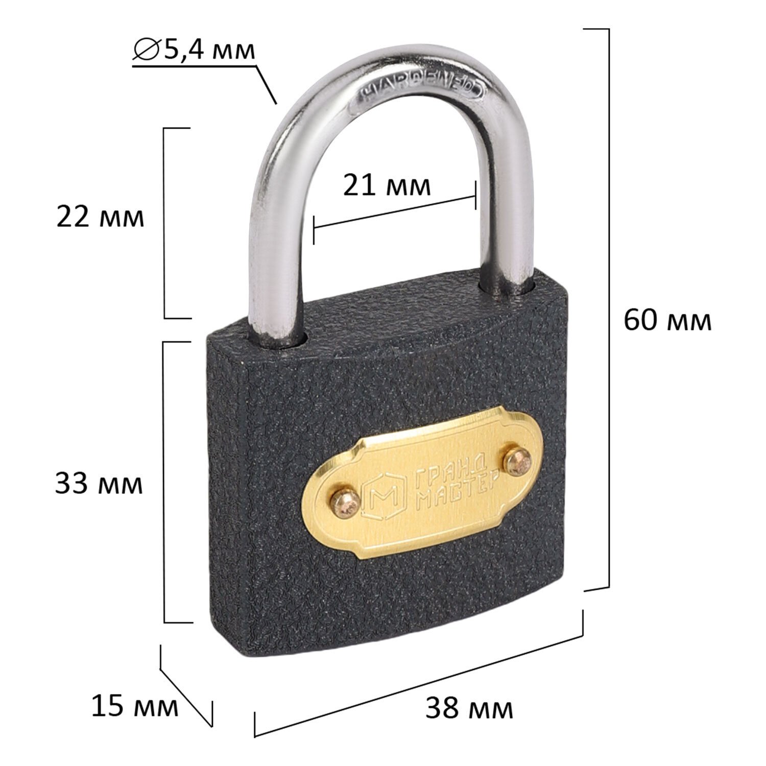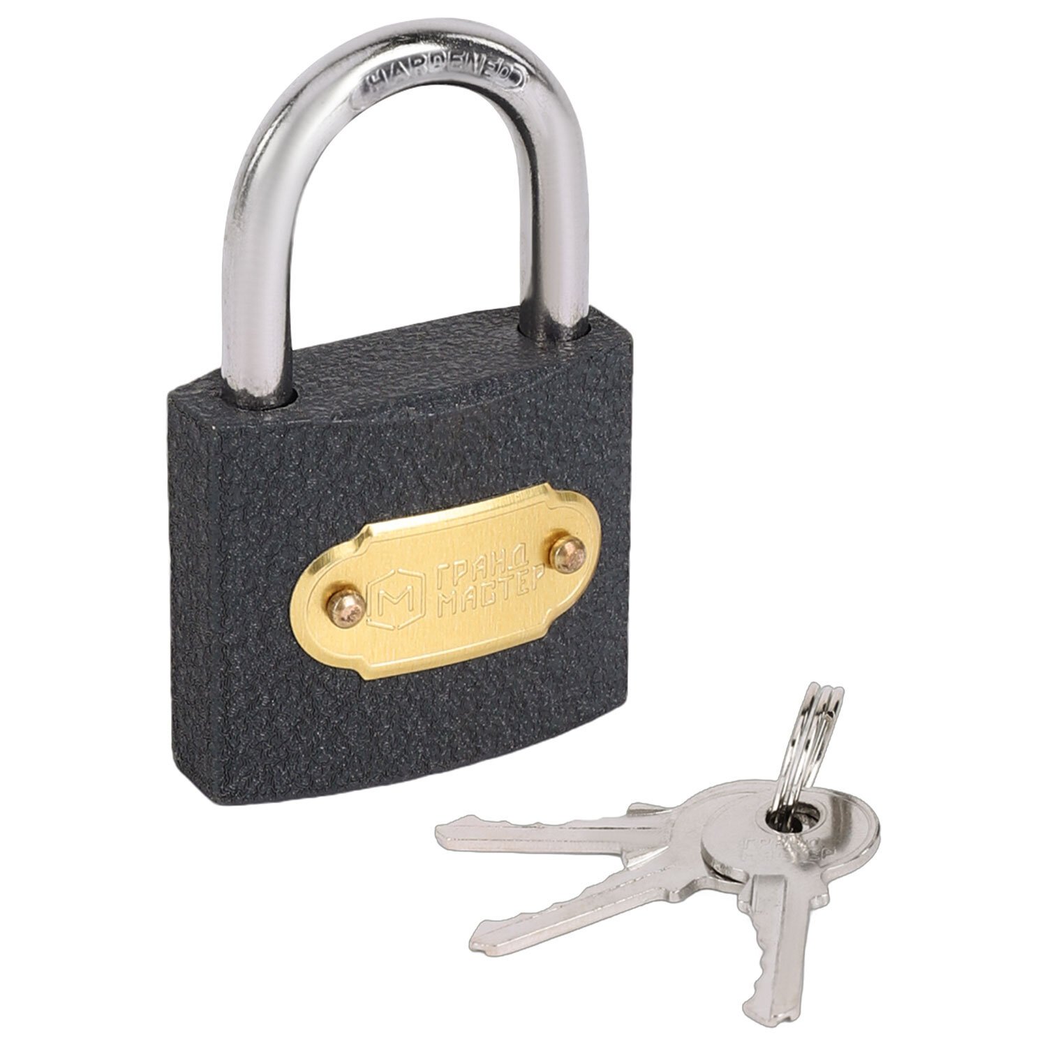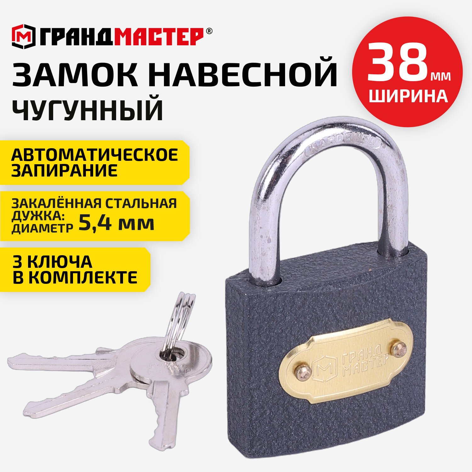 Замок навесной чугунный "Стандарт", ширина 38 мм, английский, 3 ключа, ГРАНДМАСТЕР, 671291