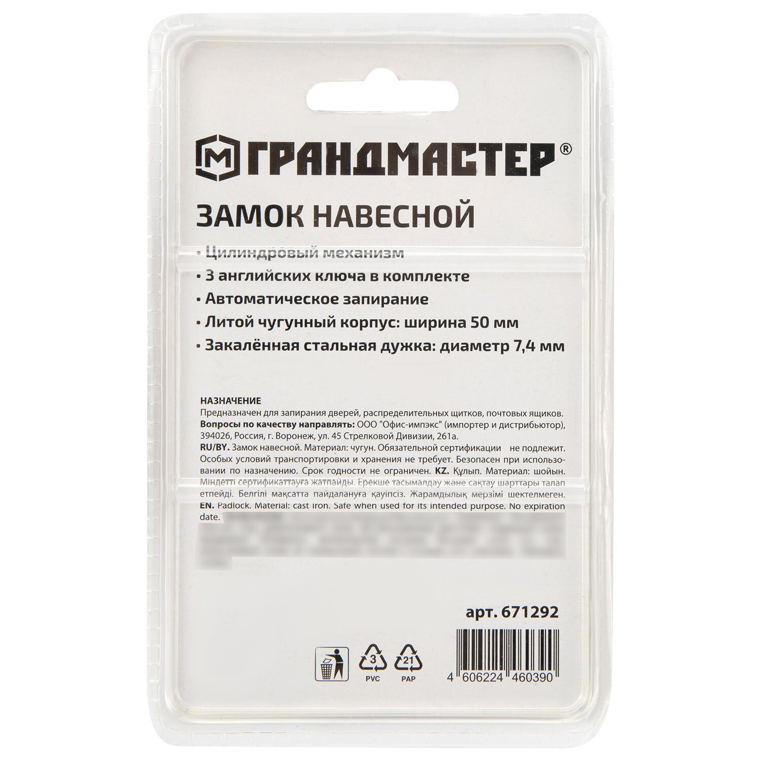 Замок навесной чугунный "Стандарт", ширина 50 мм, английский, 3 ключа, ГРАНДМАСТЕР, 671292