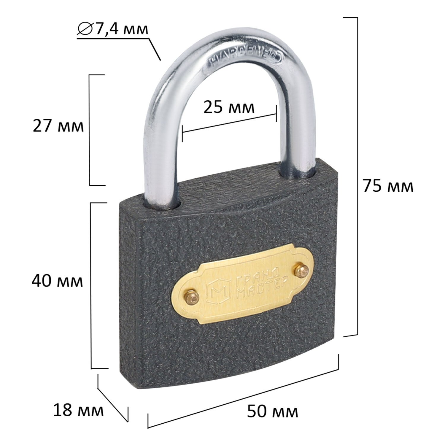 Замок навесной чугунный "Стандарт", ширина 75 мм, английский, 3 ключа, ГРАНДМАСТЕР, 671294