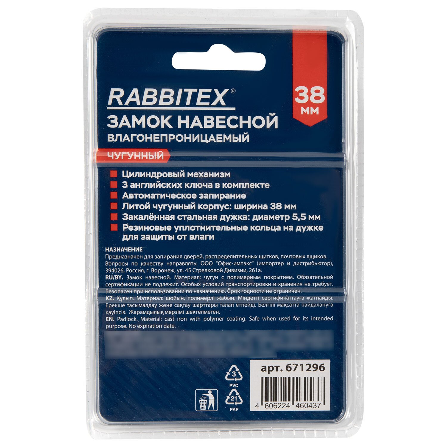Замок навесной чугунный "Влагонепроницаемый", ширина 38 мм, полимерное покрытие, английский, 3 ключа, RABBITEX, 671296