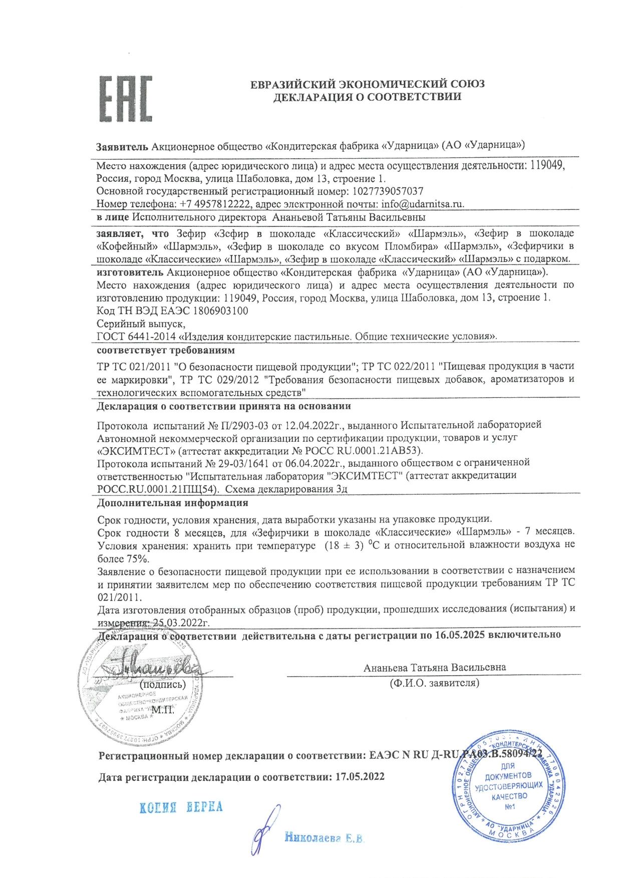 Рецепт десерта был создан более 50 лет назад кондитерами московской фабрики «Ударница». В составе зефира – натуральное яблочное пюре, яичный белок и агар-агар (уникальное вещество из морских водорослей).