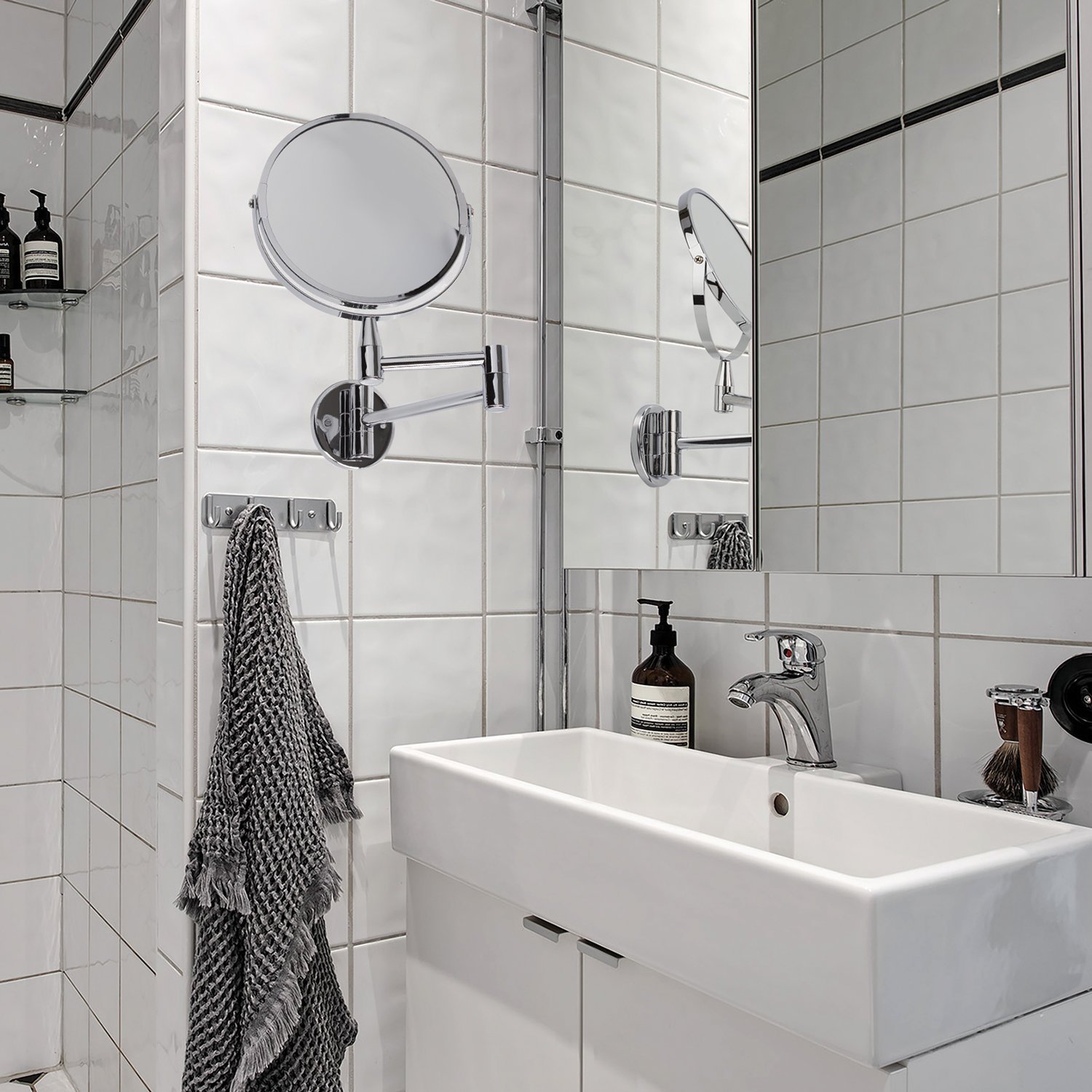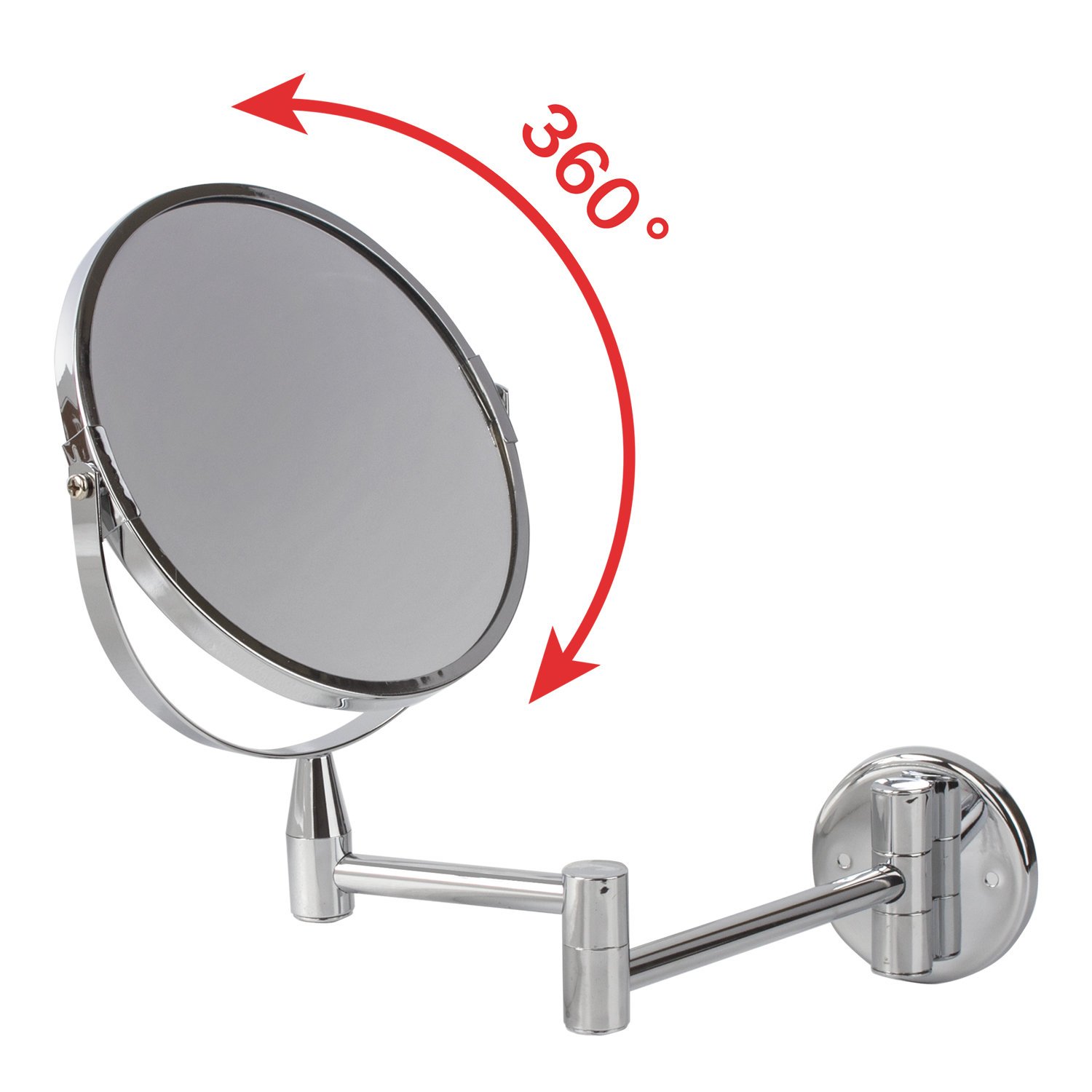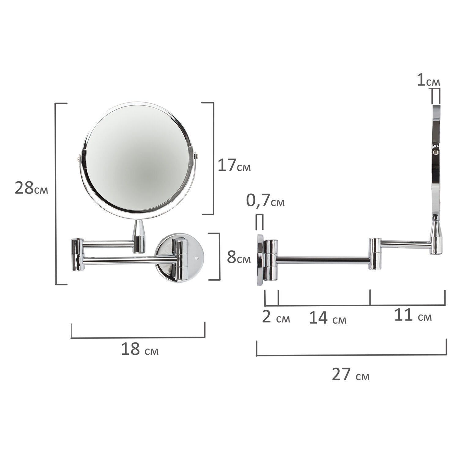 Эффект 2-х кратного увеличения позволит тщательно и аккуратно произвести самые сложные манипуляции в макияже. Также удобно для использования во время бритья. Зеркало поворачивается вокруг своей оси, что создает дополнительные удобства при использовании. Оправа выполнена из хромированной стали. Диаметр зеркала составляет 17 см.