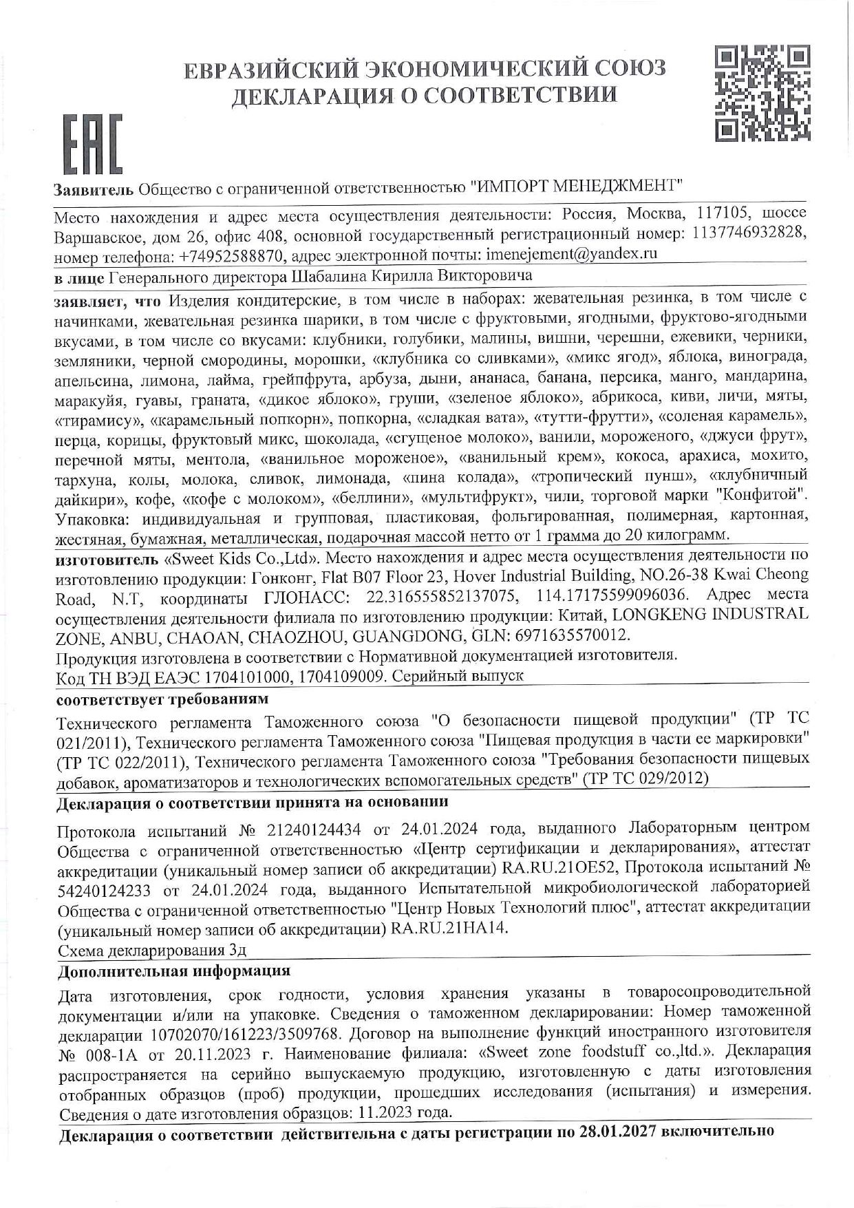 Состав: сахар, глюкозный сироп, резиновая основа, регуляторы кислотности (лимонная кислота, яблочная кислота), ароматизаторы ("арбуз", "клубника", "банан", "ананас"), кукурузный крахмал, агент влагоудерживающий (глицерин), красители (E110, E129, E133, E102).
