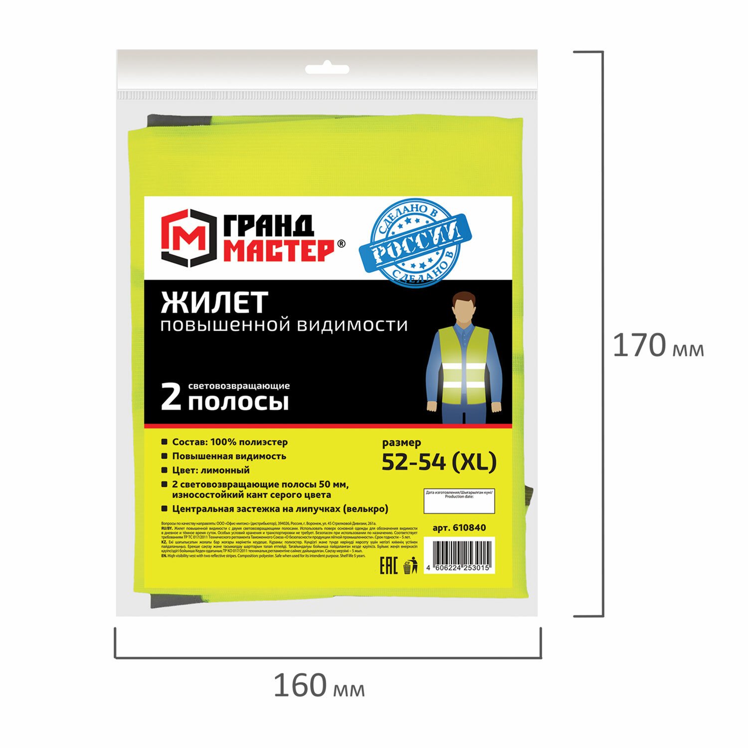 Жилет сигнальный ГОСТ, 2 светоотражающие полосы, ЛИМОННЫЙ, XL (52-54), ПЛОТНЫЙ, ГРАНДМАСТЕР, 610834