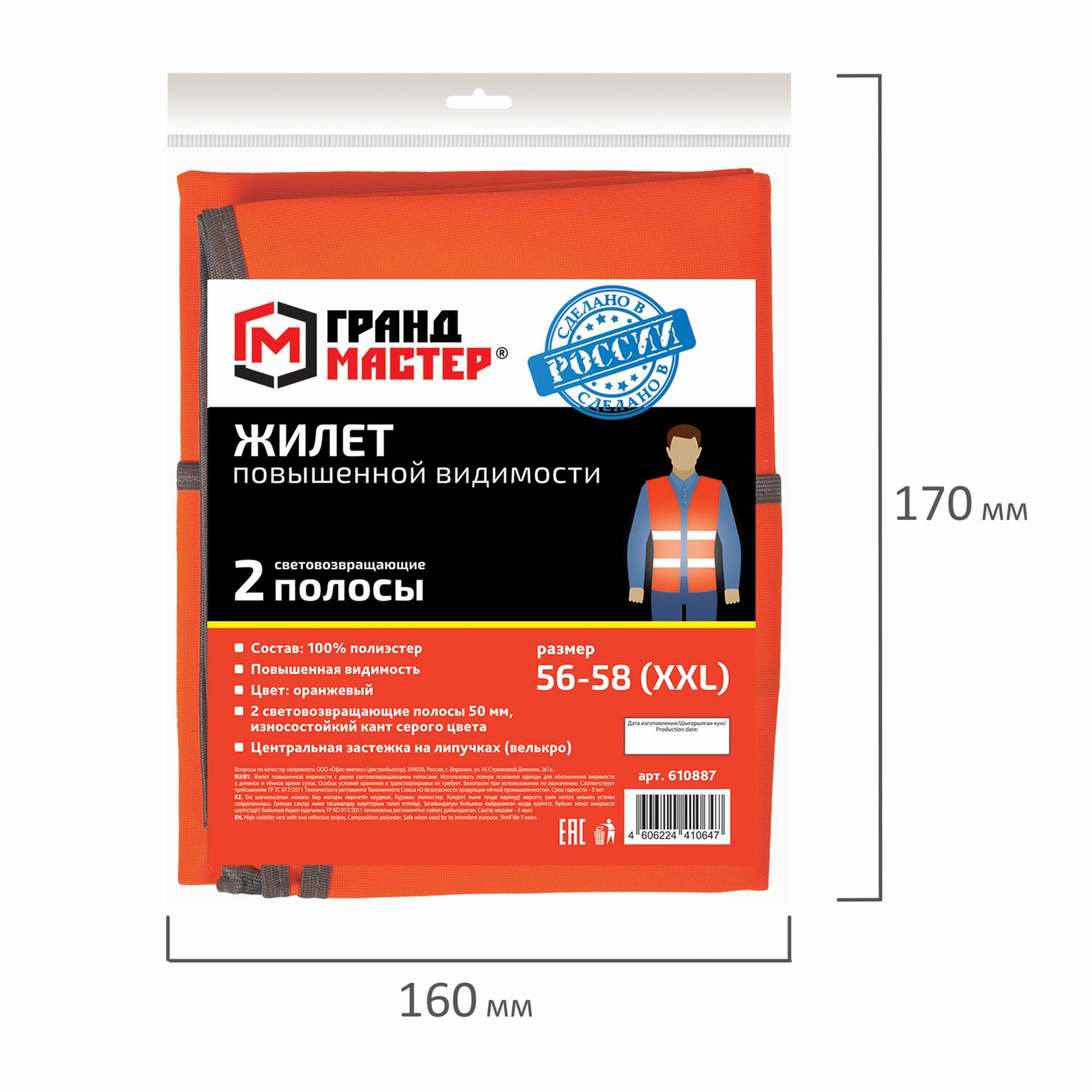 Жилет сигнальный ГОСТ, 2 светоотражающие полосы, ОРАНЖЕВЫЙ, XXXL (60-62), ПЛОТНЫЙ, ГРАНДМАСТЕР, 610833