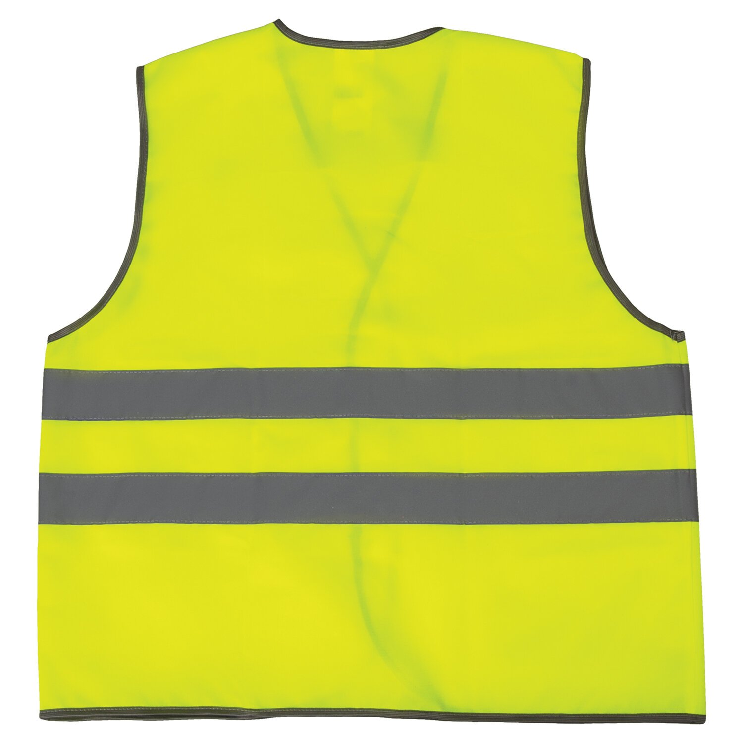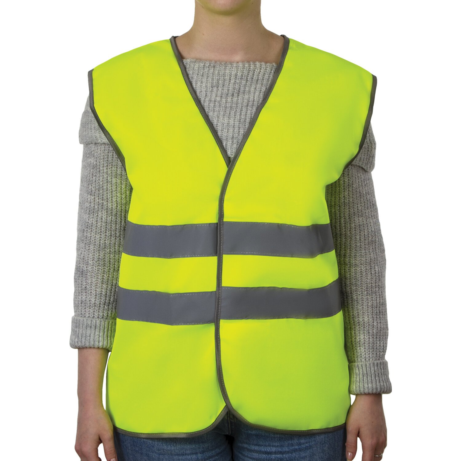 Сочетание неонового лимонного цвета и светоотражающих полос обеспечивает его заметность как днем, так и в темное время суток. Жилет с центральной застежкой на ленту-липучку надевается поверх другой одежды. Изделие соответствует второму классу защиты, изготовлено из 100% полиэстера плотностью 120 г/м2. Ширина светоотражающей ленты – 50 мм.