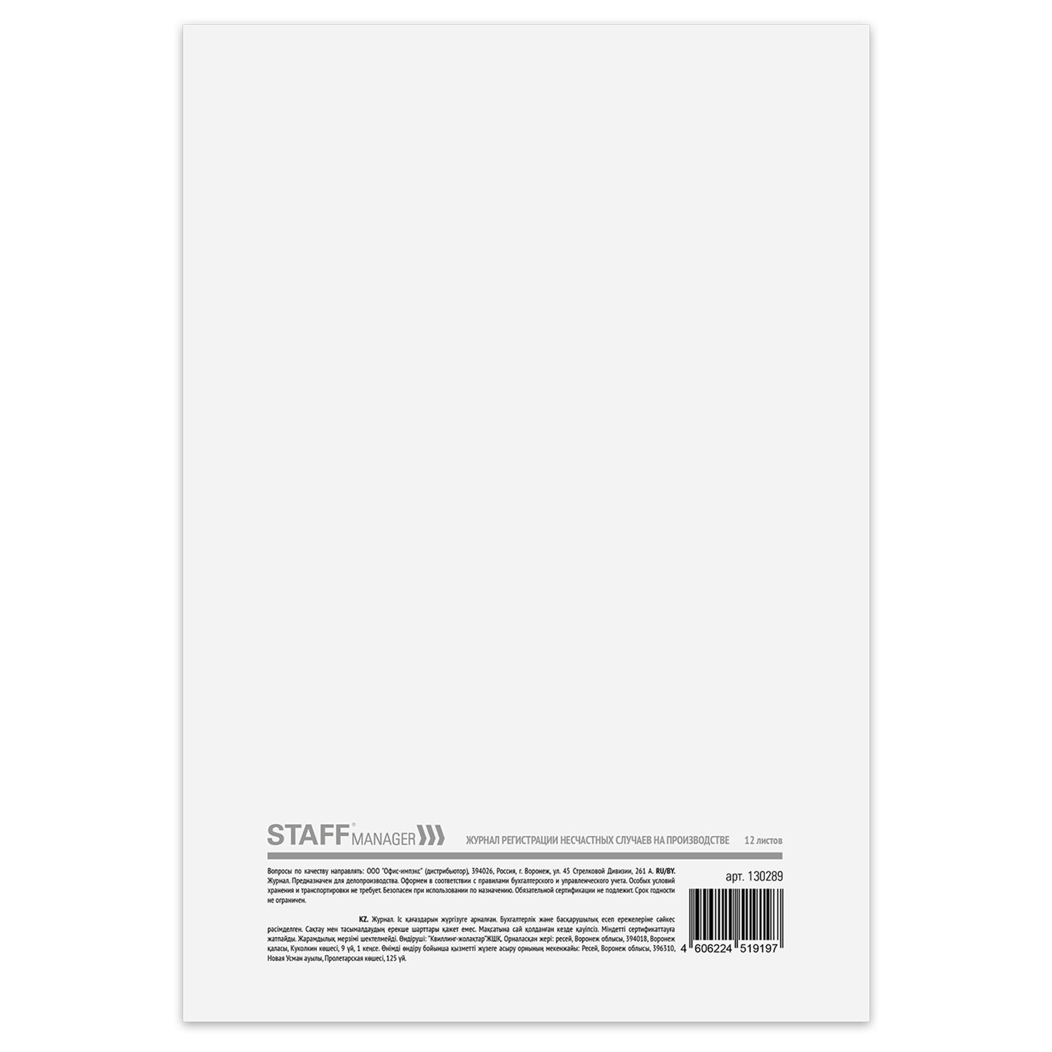 Журнал регистрации несчастных случаев на производстве STAFF оформлен в соответствии с правилами бухгалтерского и управленческого учета. Отличается высоким качеством обложки и внутреннего блока.