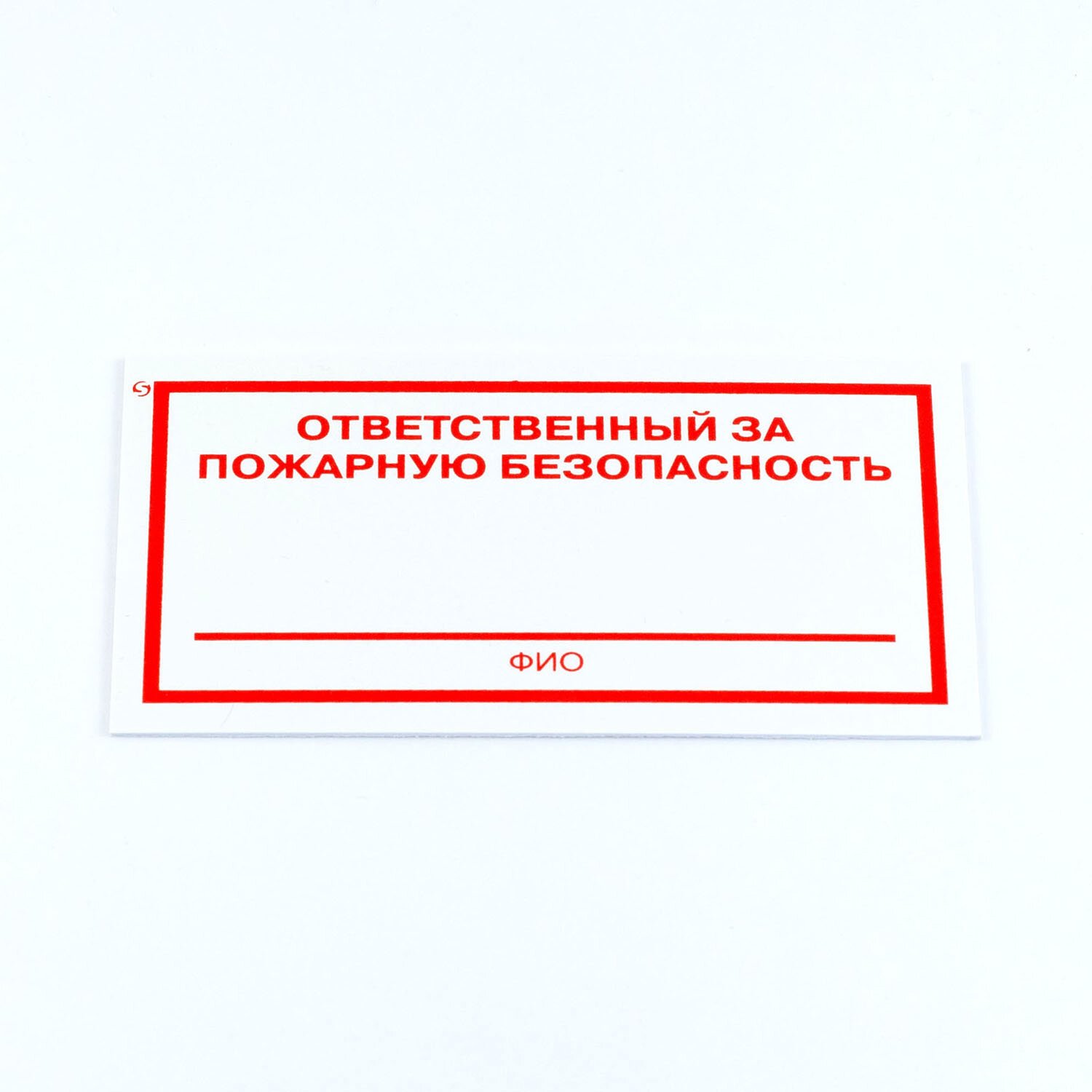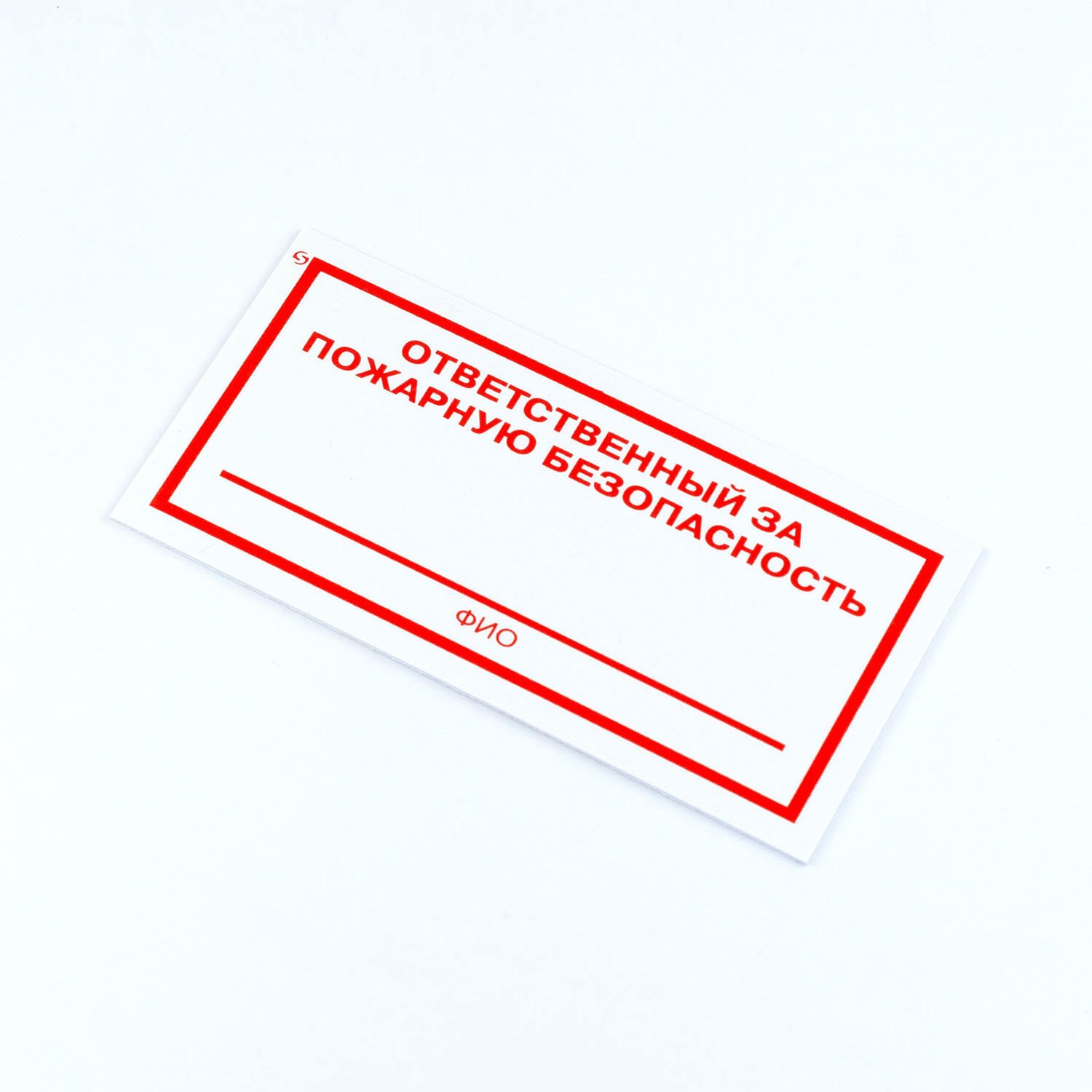 Знак безопасности "Ответственный за пожарную безопасность" представляет собой пластиковую табличку на дверь или стену, на которой обозначается фамилия ответственного человека за пожарную безопасность. Отверстия под подвес и клеевой слой отсутствуют.