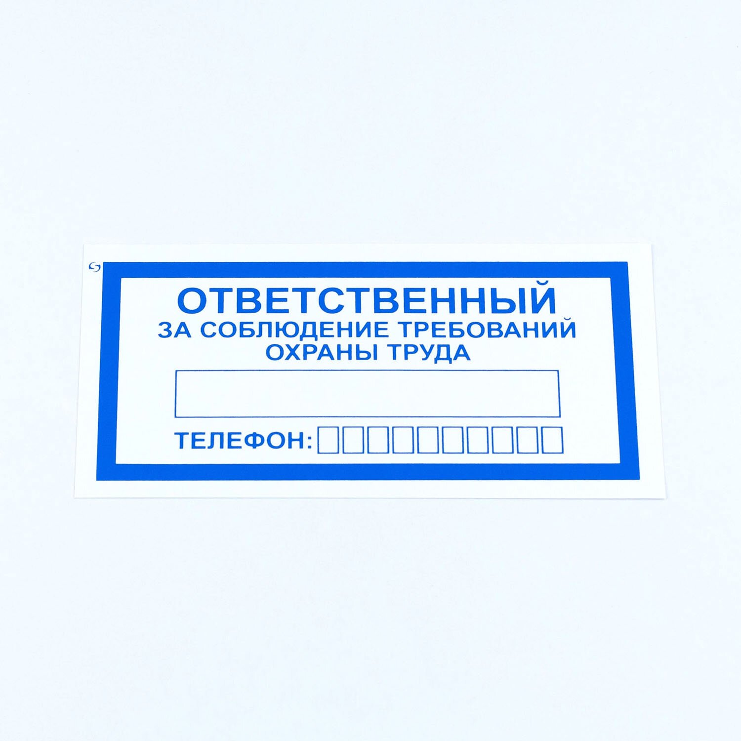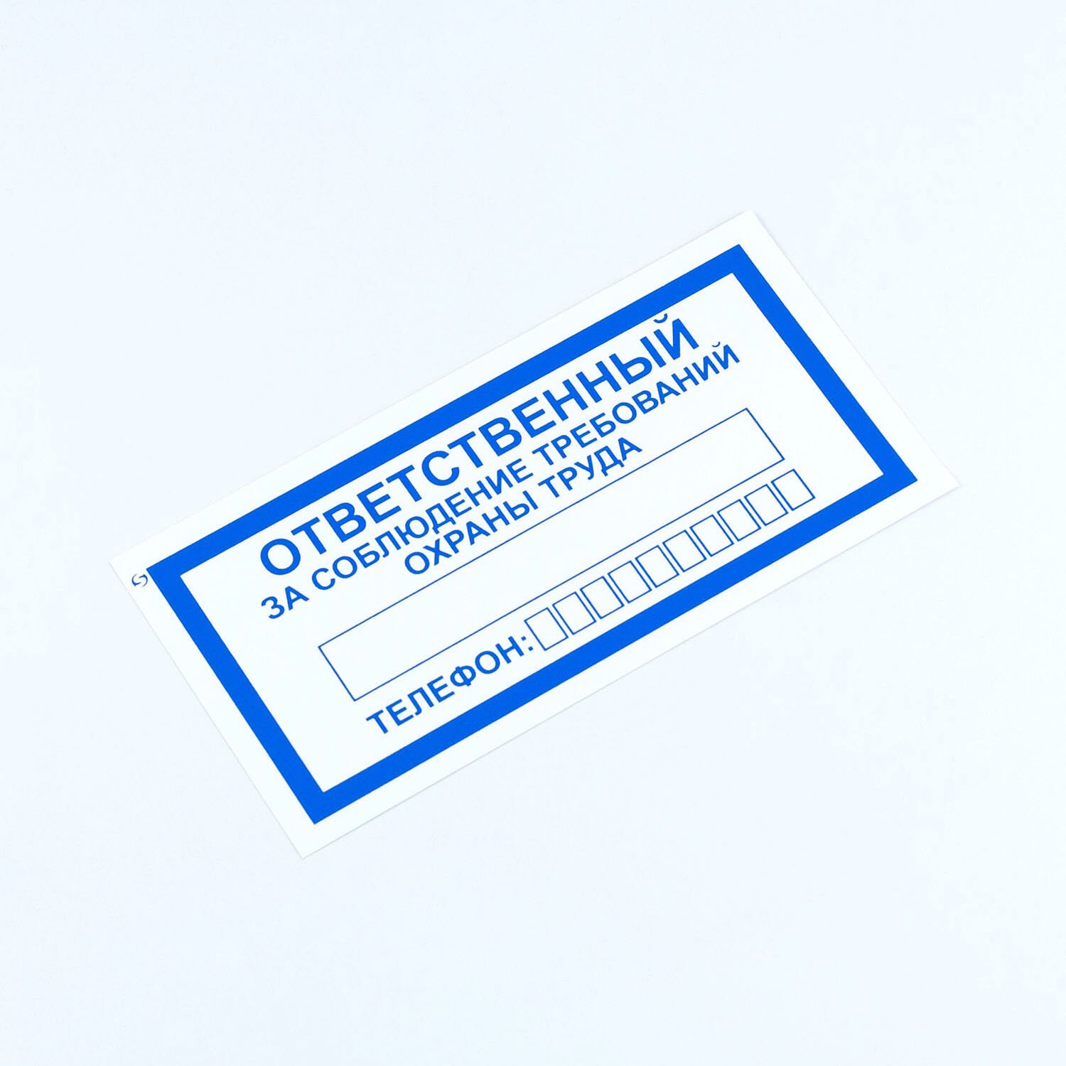 Знак информирует об ответственном за соблюдение требований правил охраны труда, предназначен для предоставления информации о фамилии, должности ответственного сотрудника и его контактном телефоне.