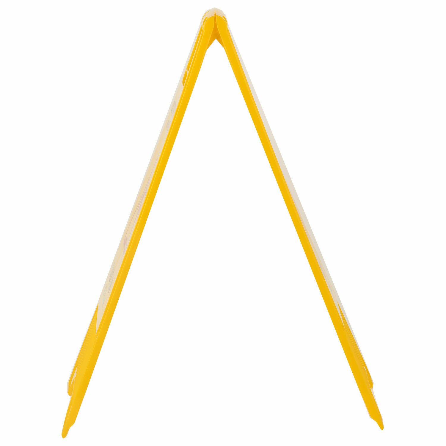 Знак выполнен из ударопрочного пластика, легко складывается и раскладывается. В сложенном виде имеет размер 62х30 см. Текст на русском и английском языках. Яркий желтый цвет позволяет увидеть знак на большом расстоянии.