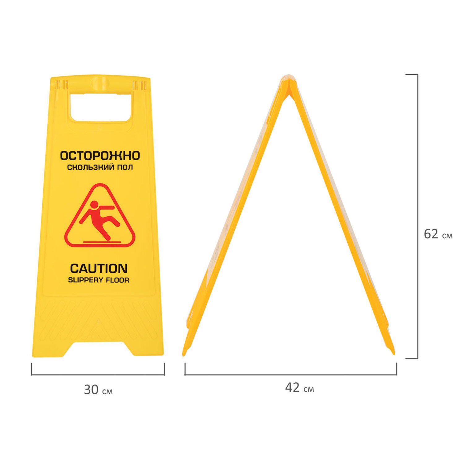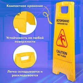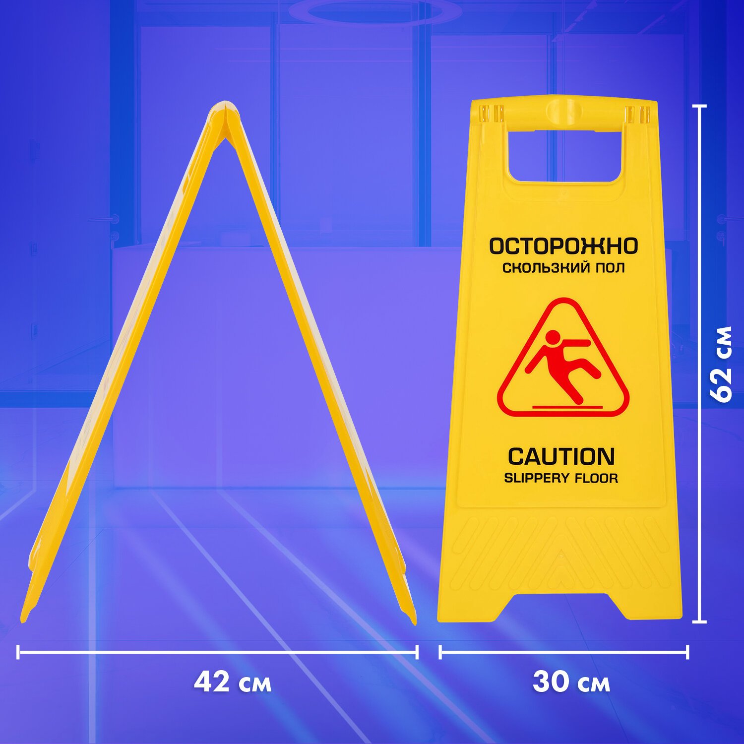 Знак предупреждающий "Осторожно! Скользкий пол!" LAIMA PROFESSIONAL предназначен для привлечения внимания и обеспечения безопасности в местах массового скопления людей. Выставляется при проведении влажной уборки.