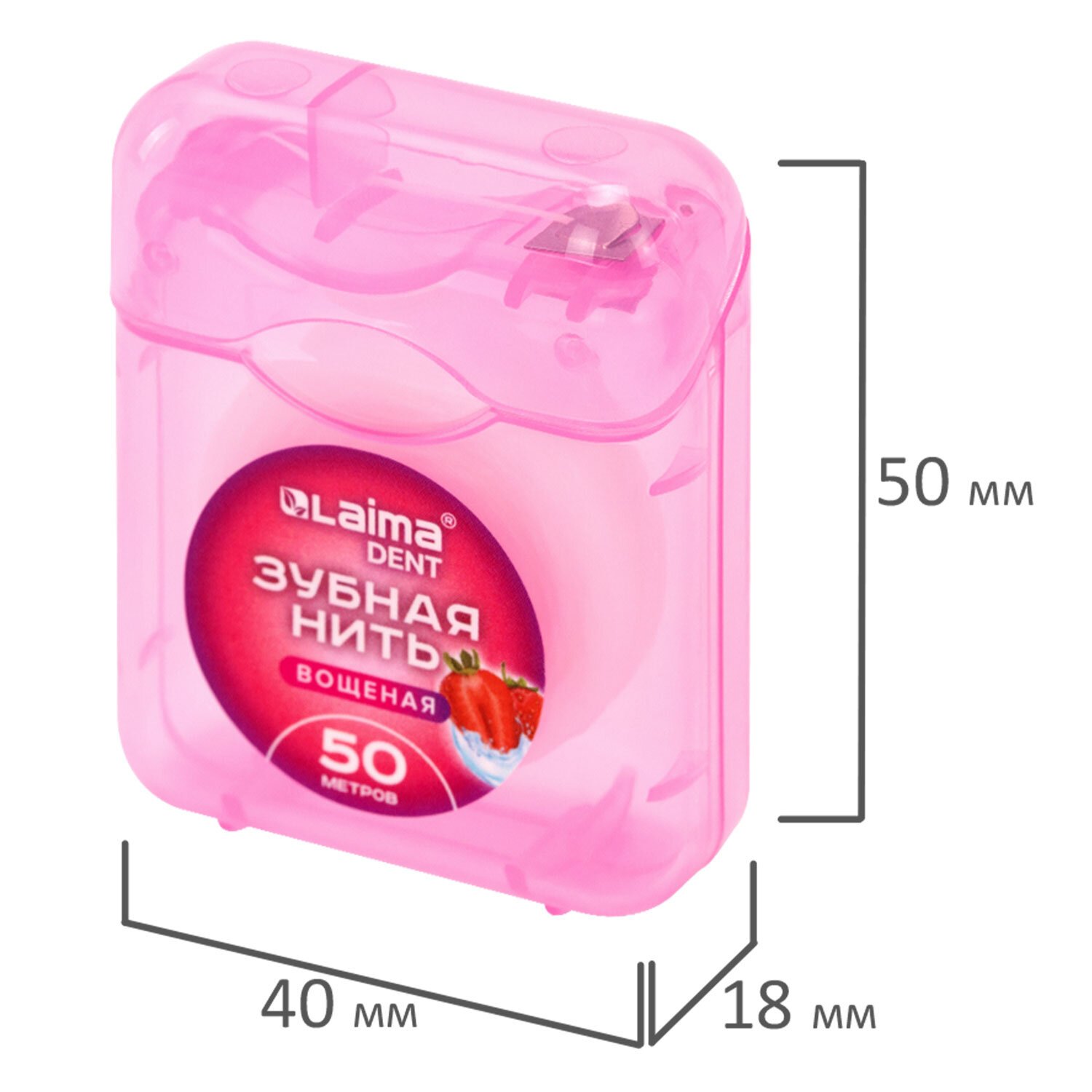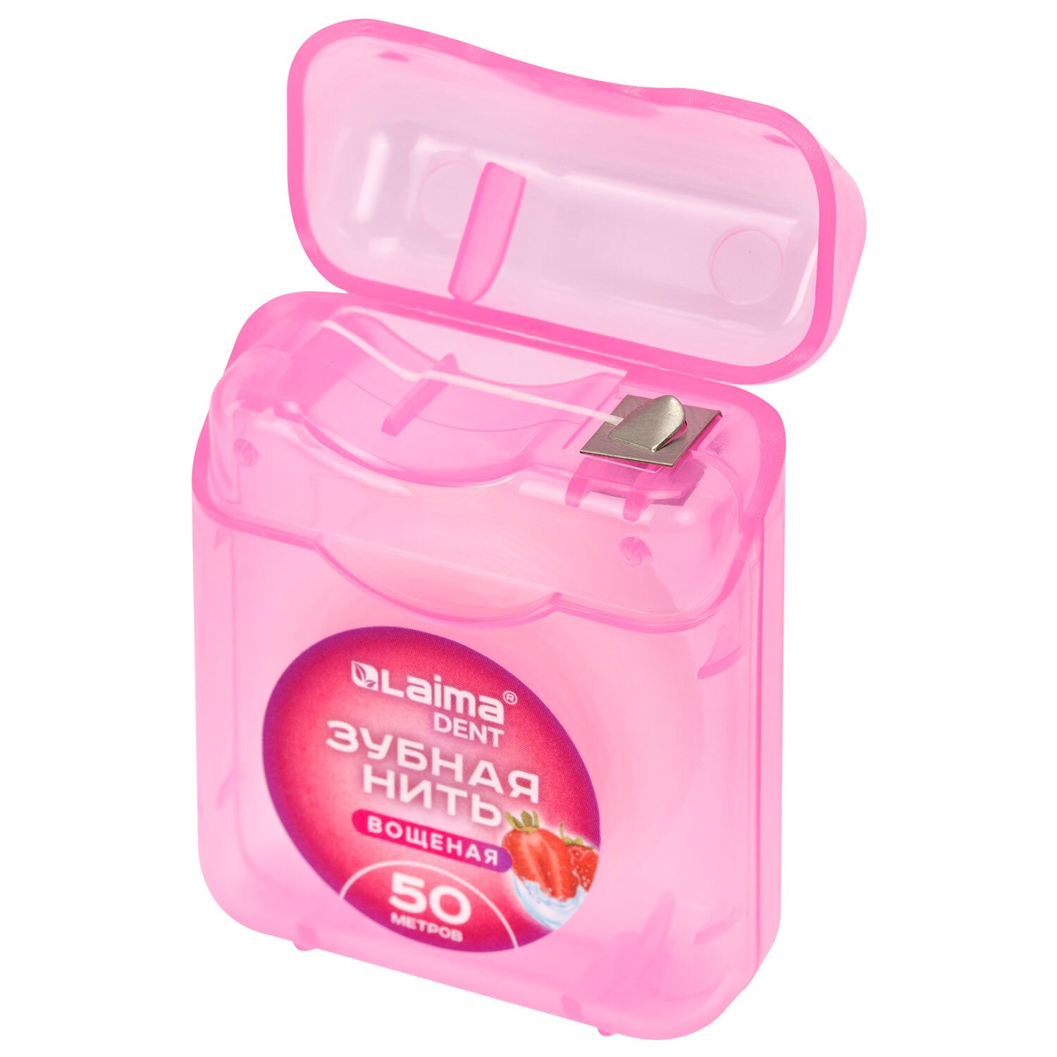 Зубная нить вощеная 50 метров с ароматом клубники упакована в стандартный корпус с резаком и блистер.