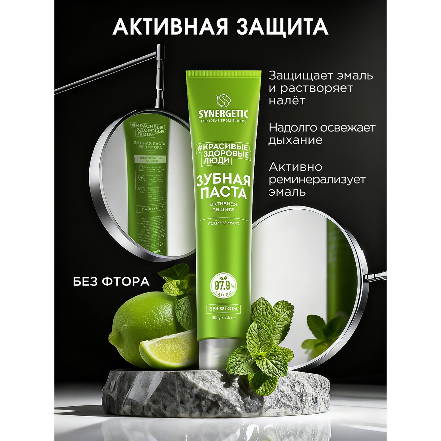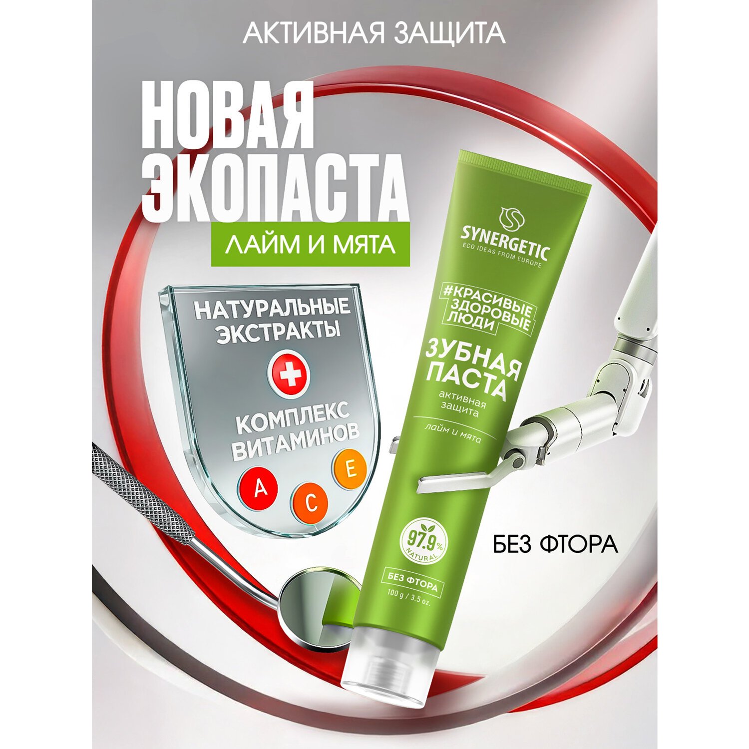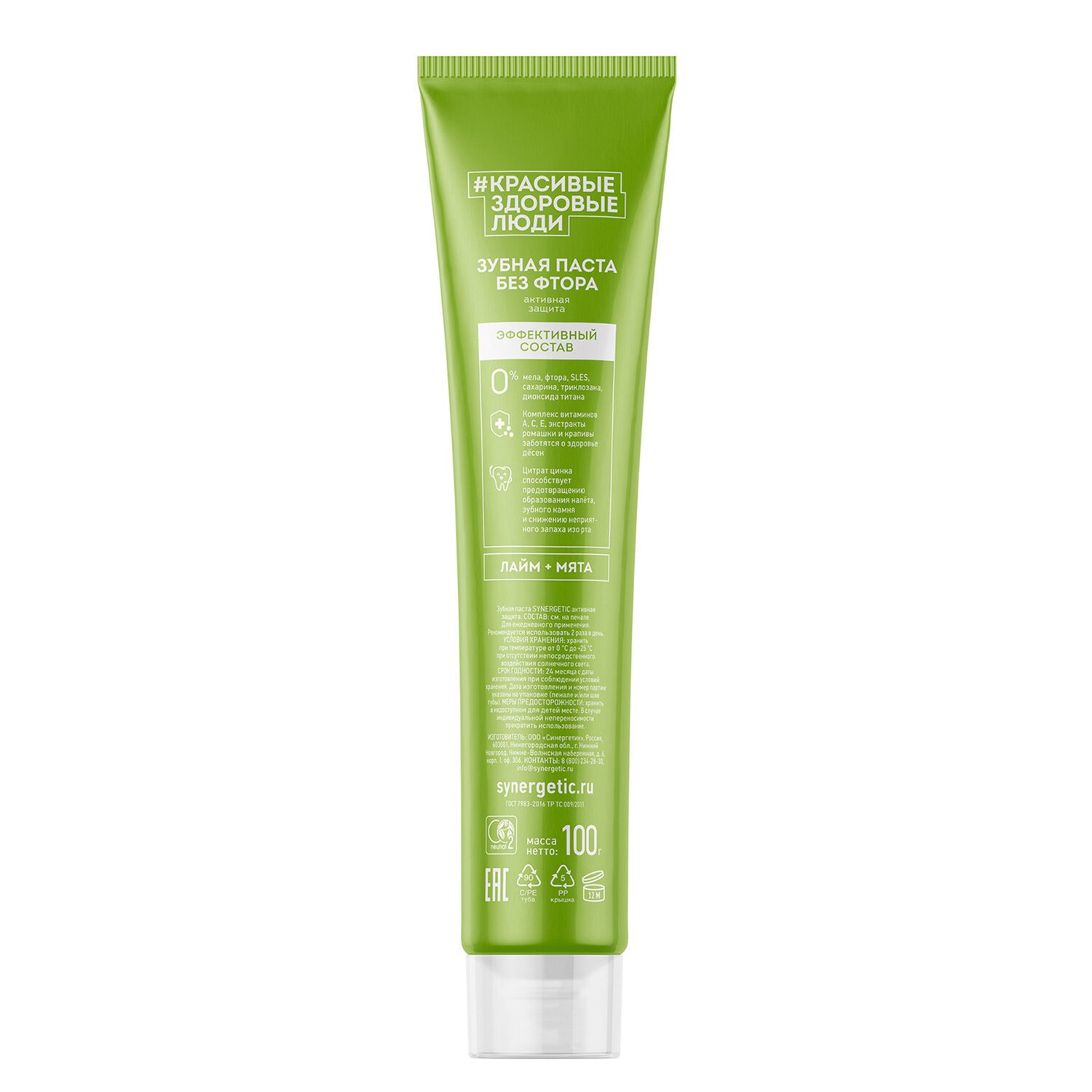Зубная паста 100 г SYNERGETIC "Активная защита", лайм и мята, без фтора, 201002